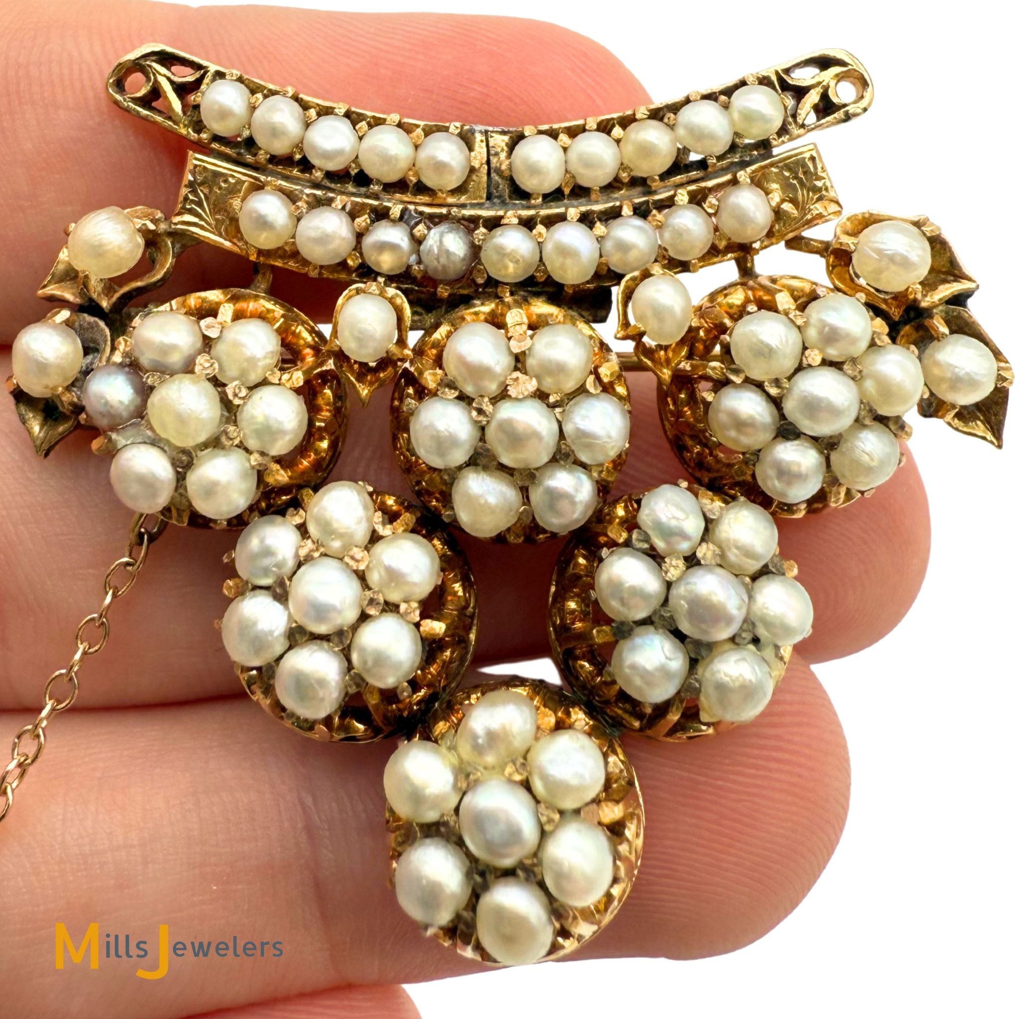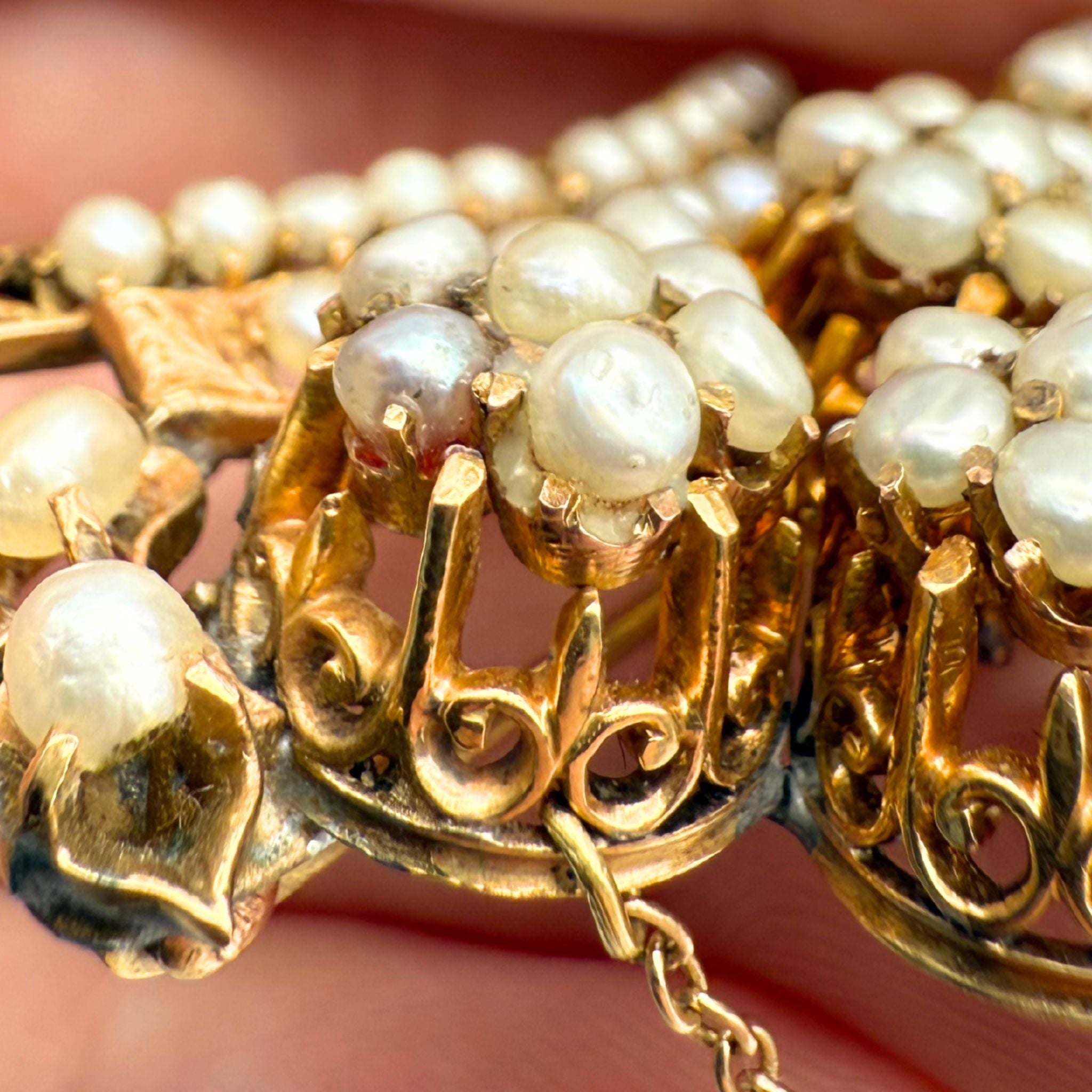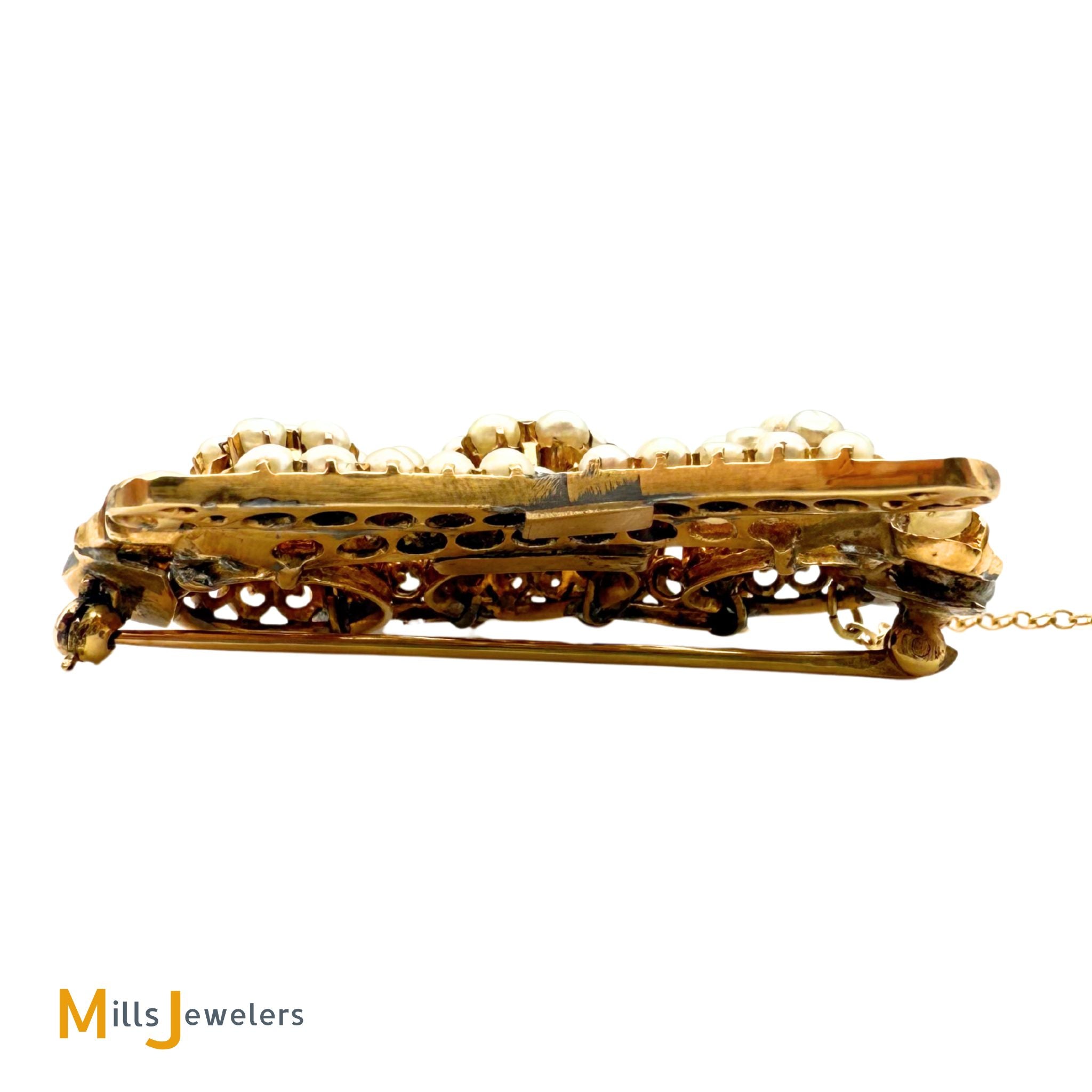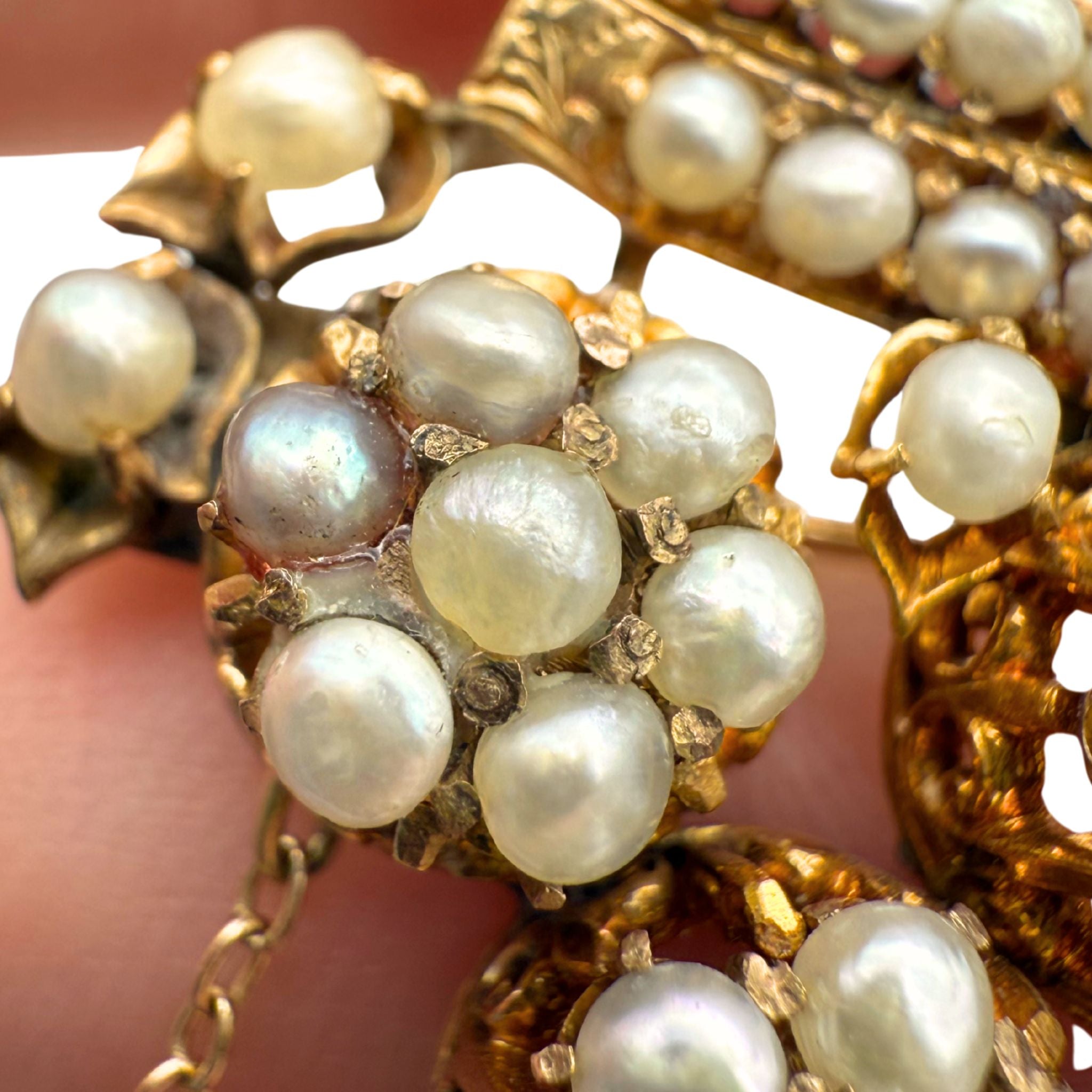 • Overall fair to good antique condition; Moderate to heavy discoloration throughout. Moderate scratching on the metal. All pearls are original and accounted for, however some appear to have been reglued in the past. Some prongs are damaged/broken but all pearls are secure (none are loose).