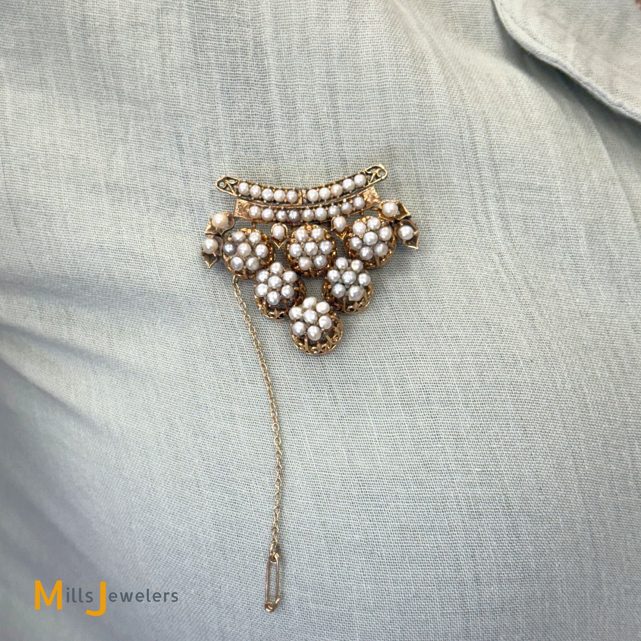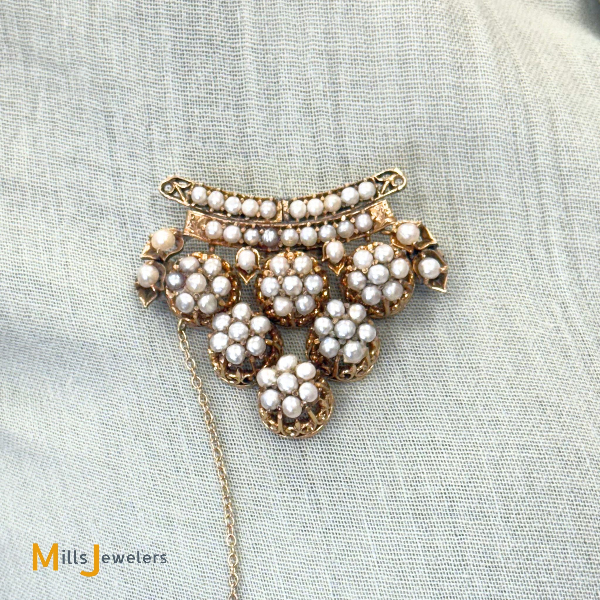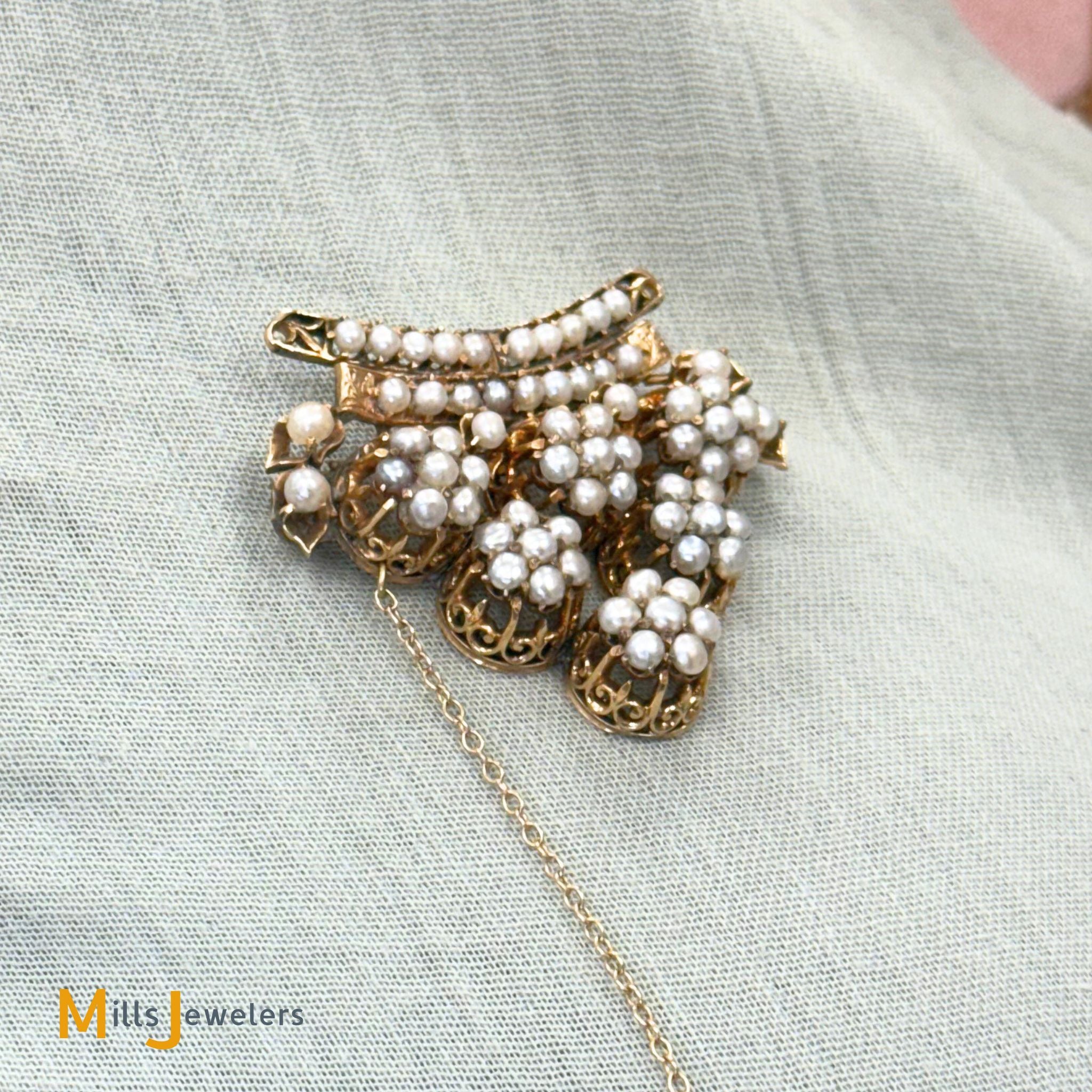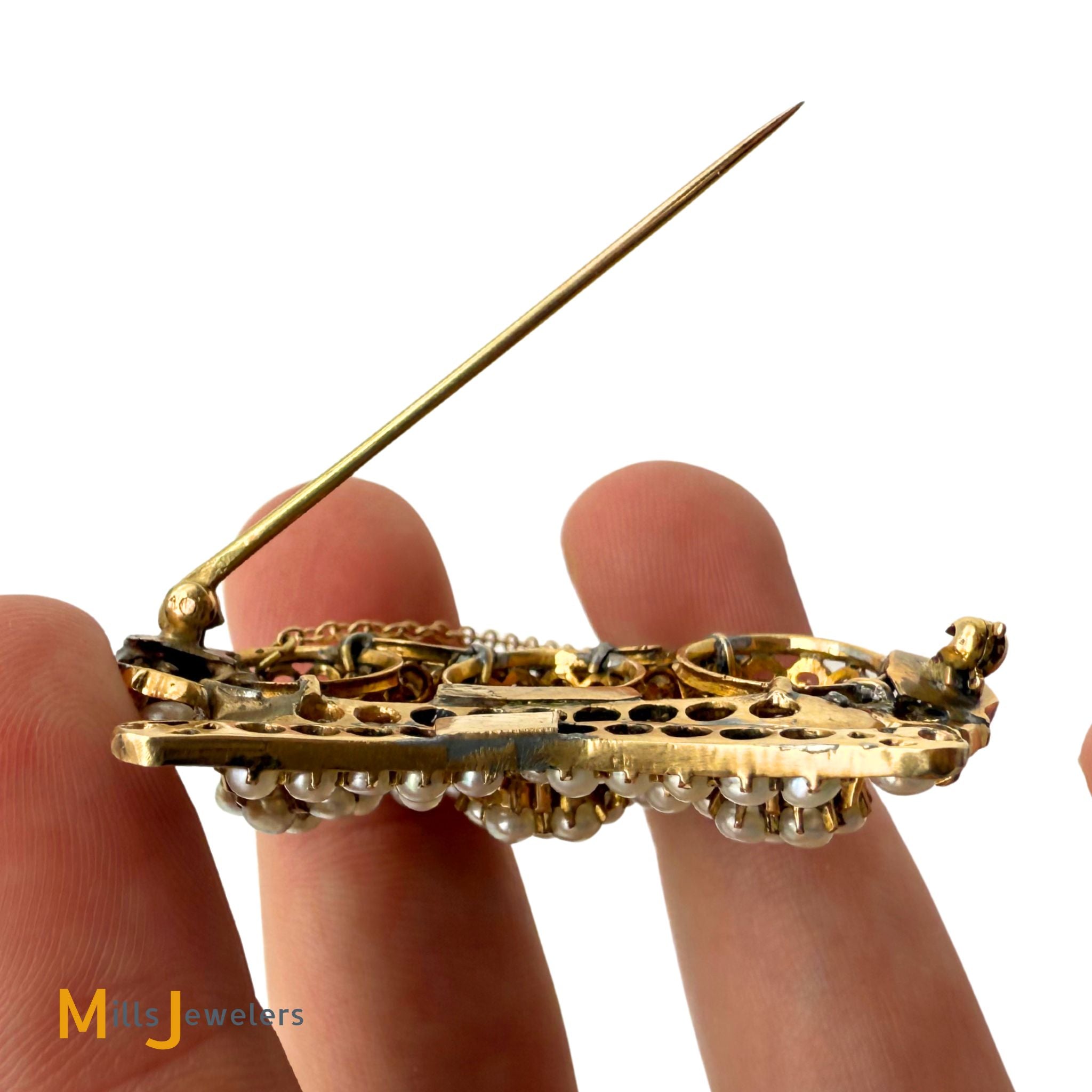 • Overall fair to good antique condition; Moderate to heavy discoloration throughout. Moderate scratching on the metal. All pearls are original and accounted for, however some appear to have been reglued in the past. Some prongs are damaged/broken but all pearls are secure (none are loose).