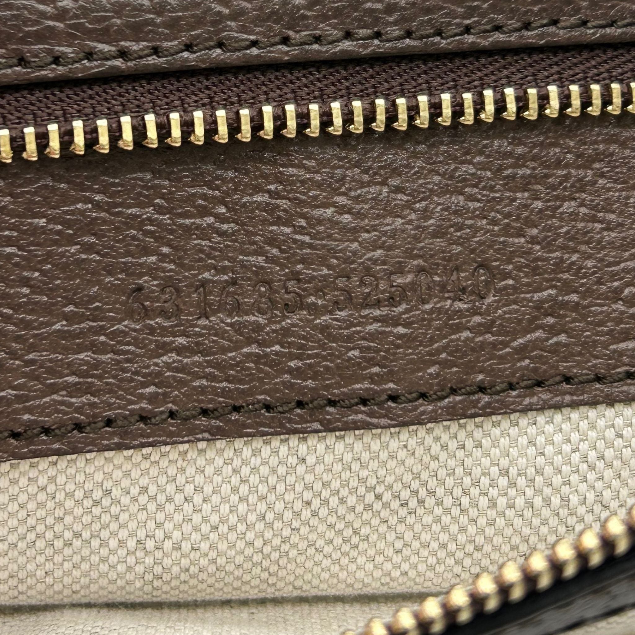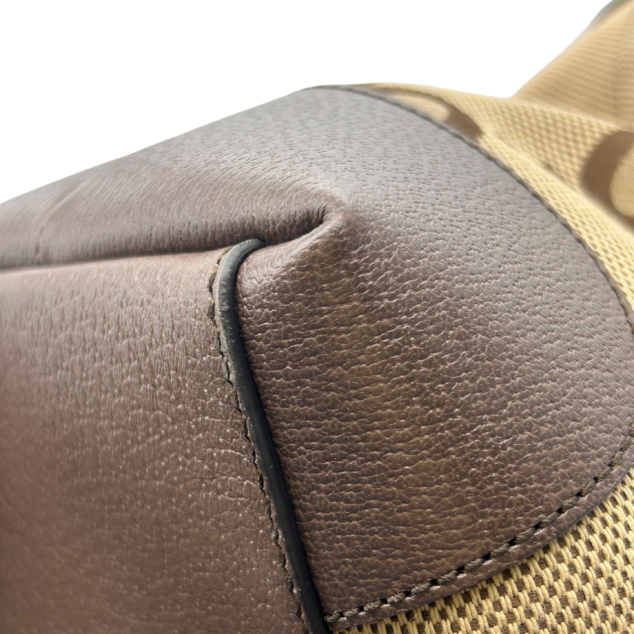 - Interior: Beige canvas fabric with brown leather trim, one (1) zipped pocket, and one (1) flat pocket.