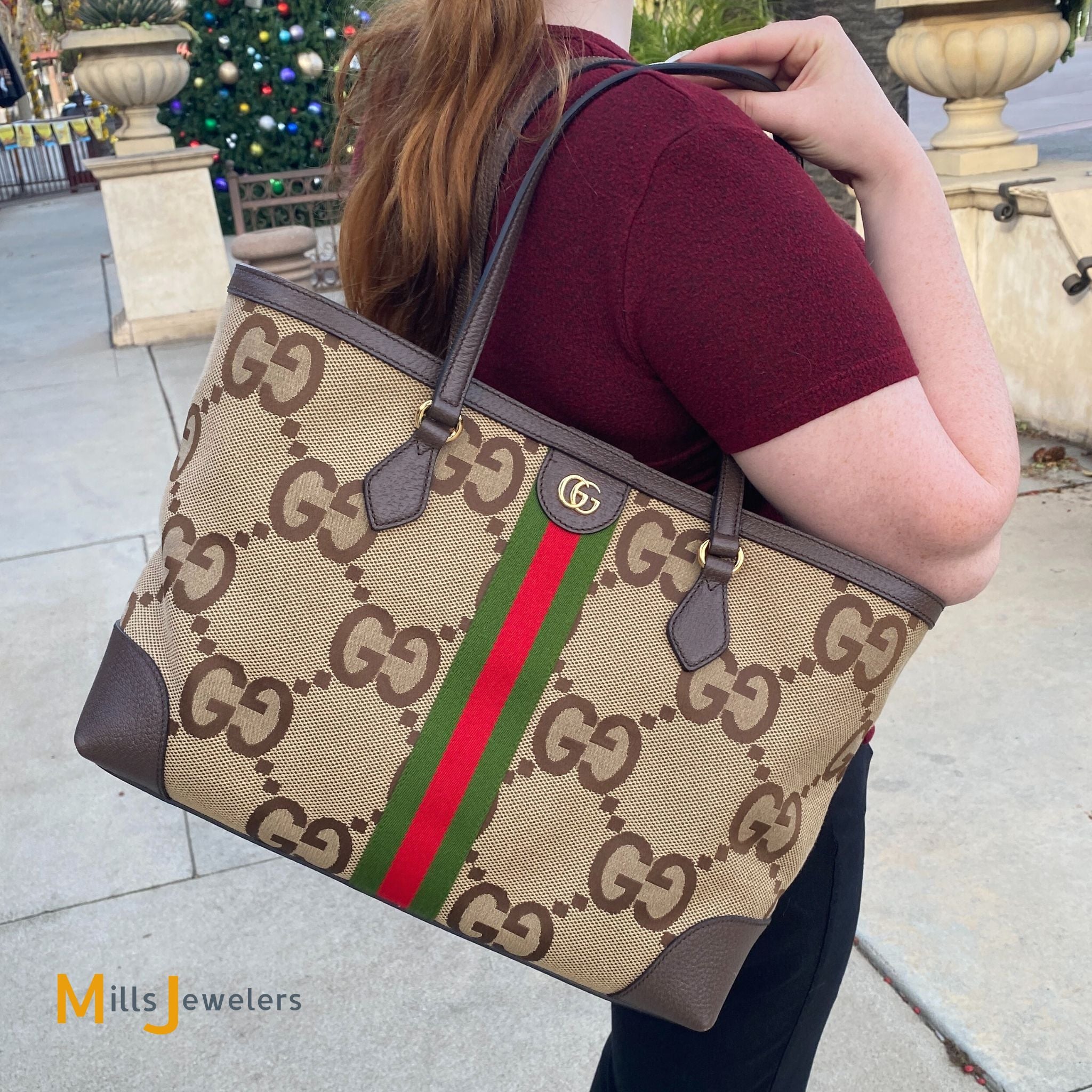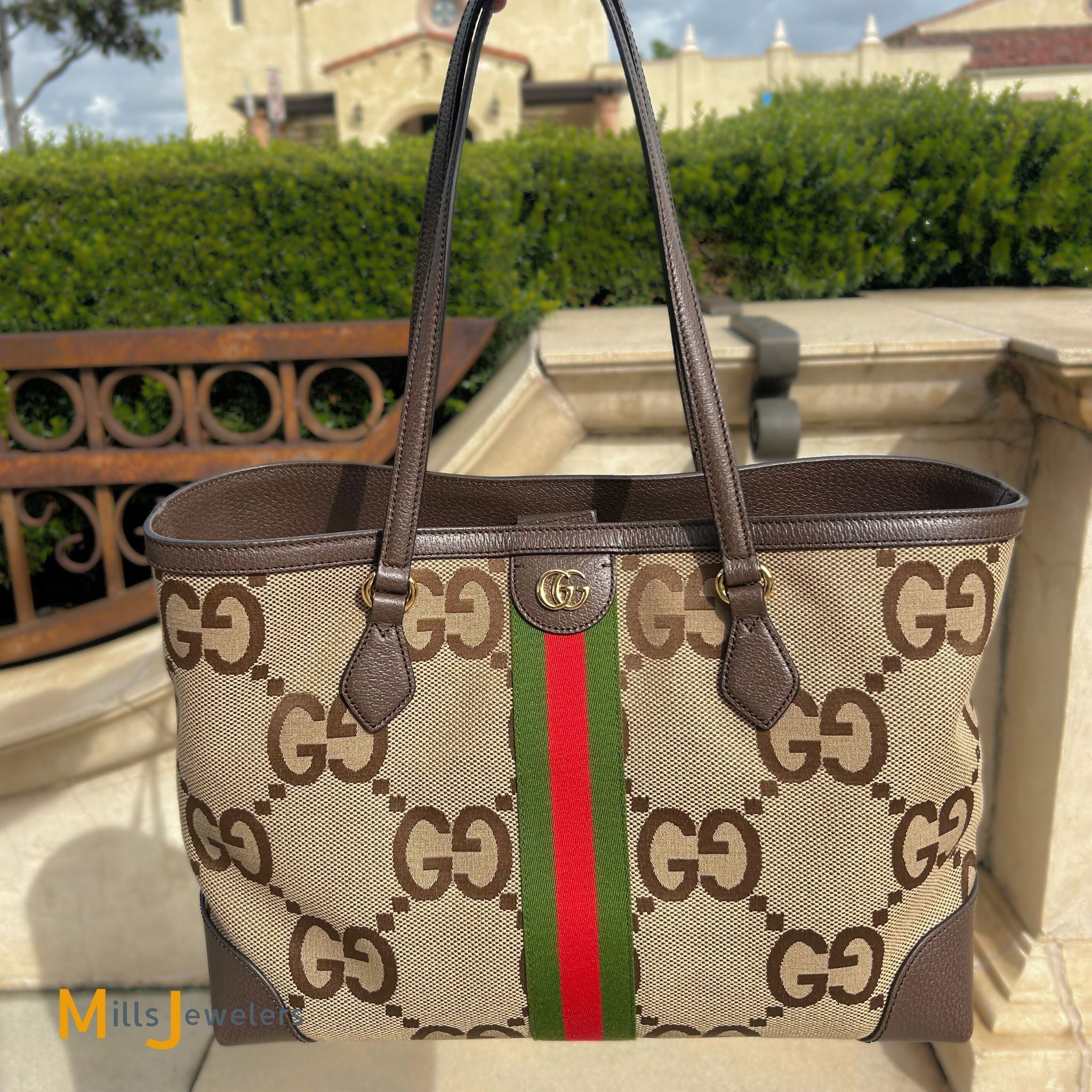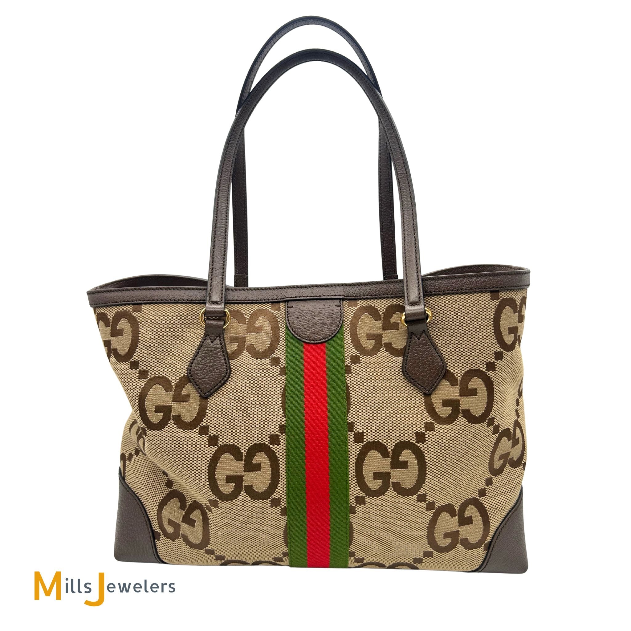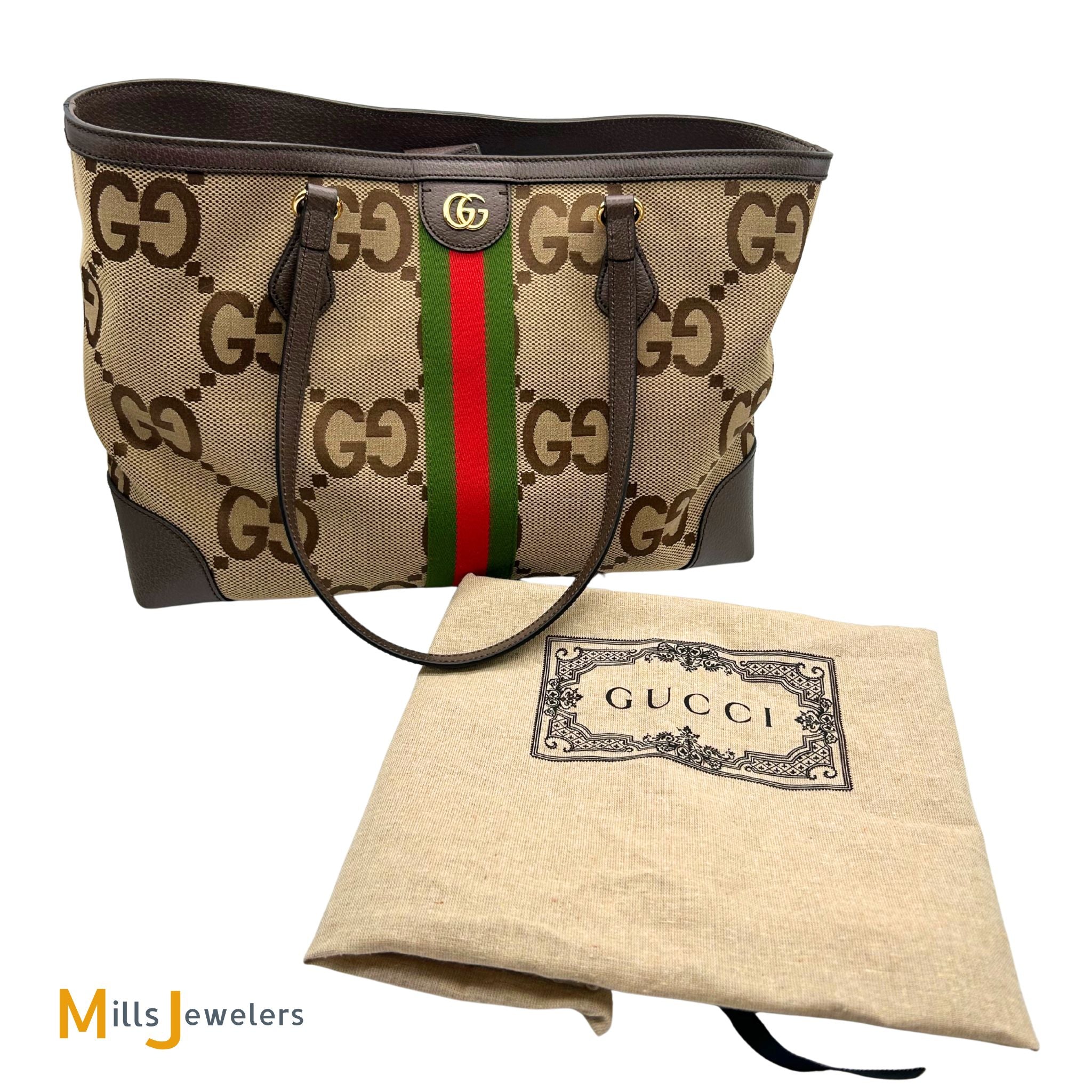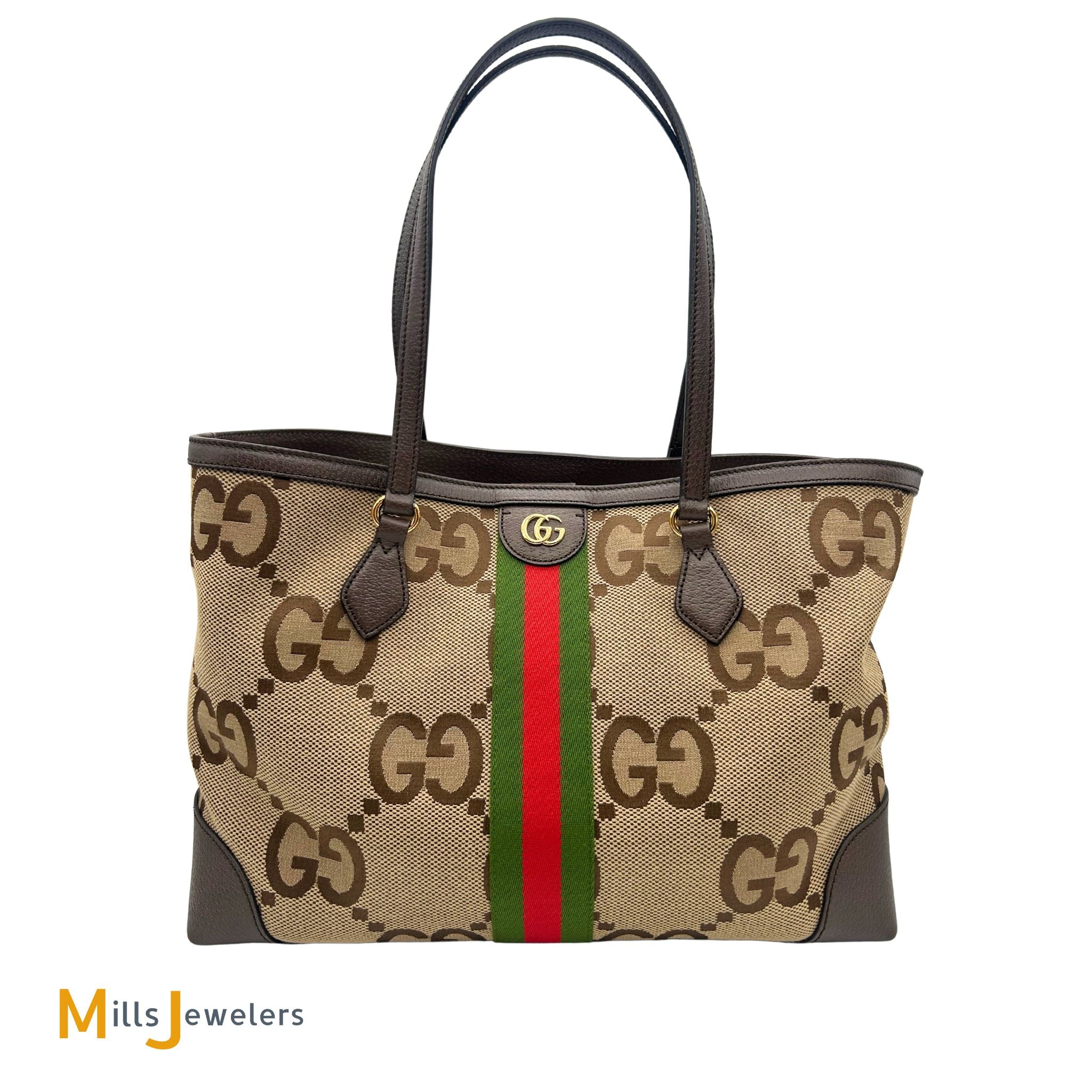 - Exterior: Gucci Jumbo GG monogram pattern on a camel colored canvas with brown leather trims. Red and green centered fabric vertical stripe. Gold color hardware