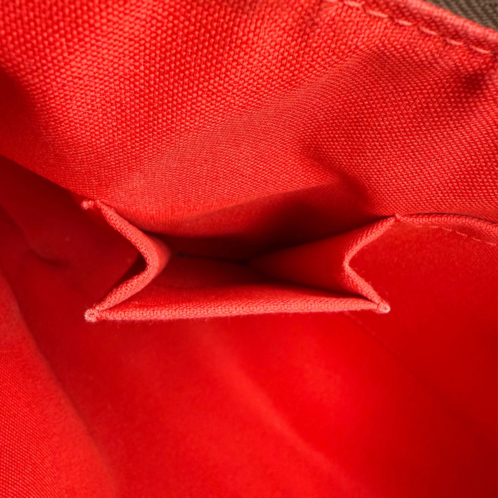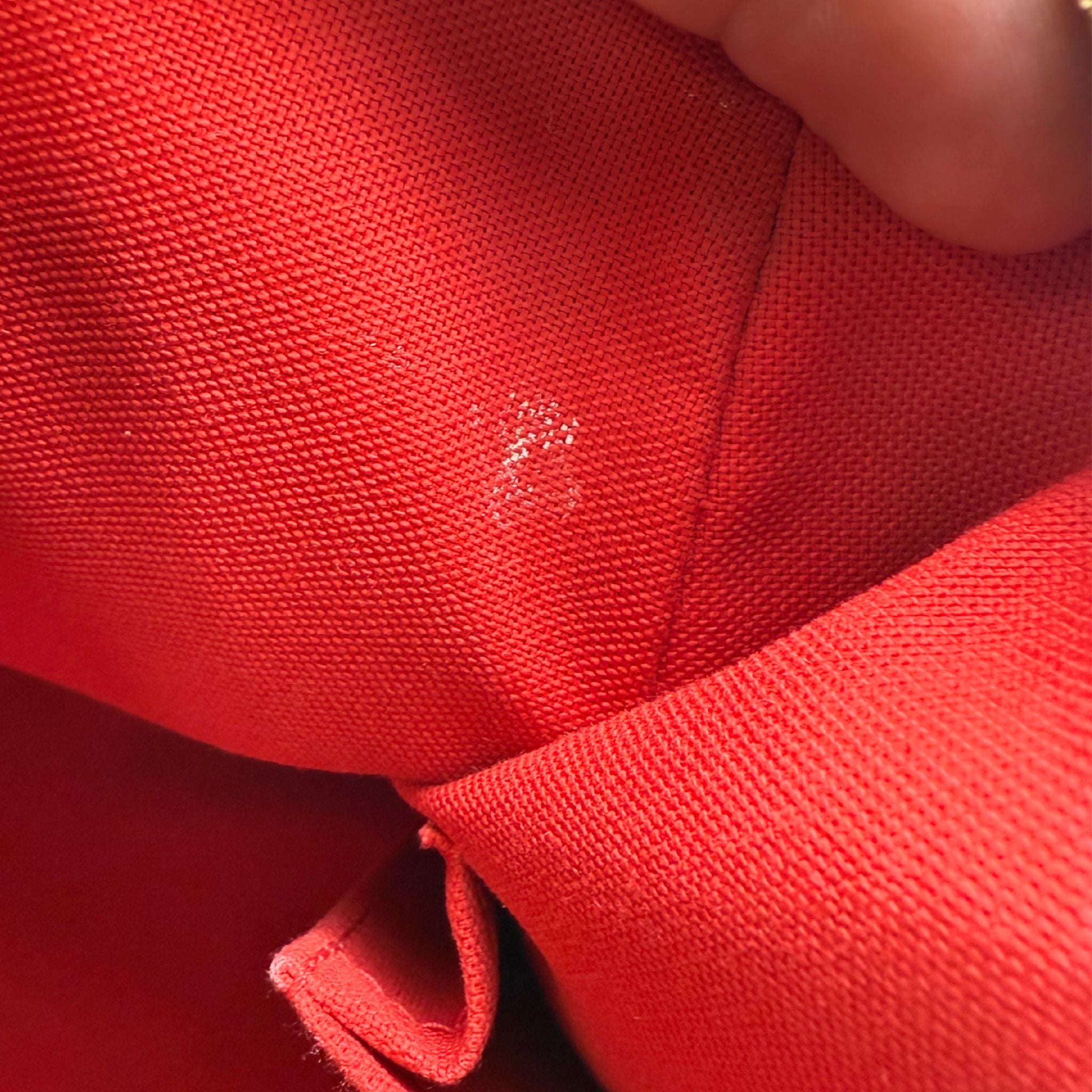 • Condition A overall: Very good condition includes little signs of wear to the coated trim, and internal liner. Exterior coated canvas in excellent shape with little to no markings or staining. Light scratching and minor discoloration on the gold-color hardware. Light discoloration on interior towards the zipper and one small white spot on the back panel.