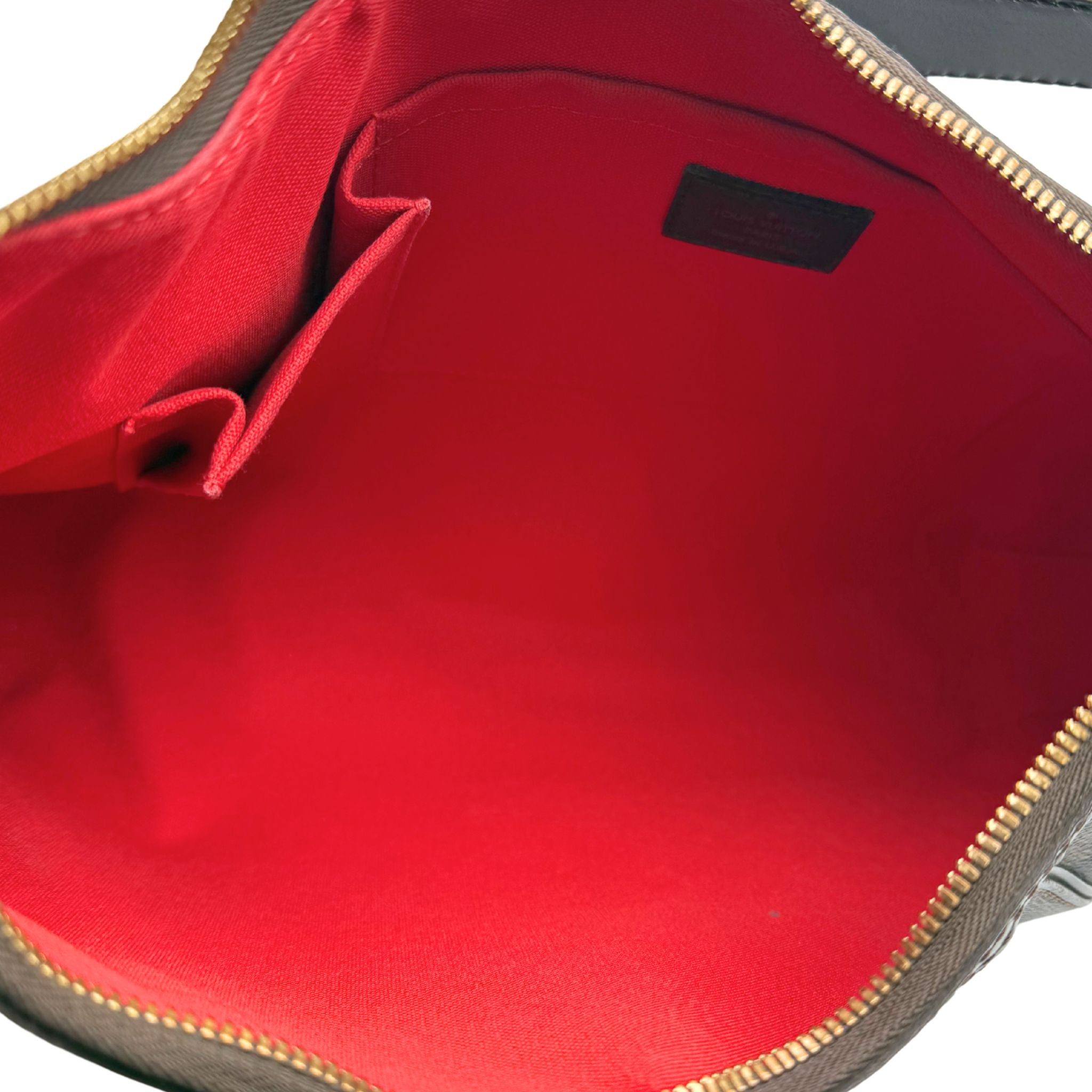 • Exterior: Brown damier ebene coated canvas with gold-color branded plaque on the front. Brown leather trim. Gold-color D rings with a brown leather adjustable strap. Adjustable strap features a gold-color branded buckle and grommets. Gold-color zipper closure.