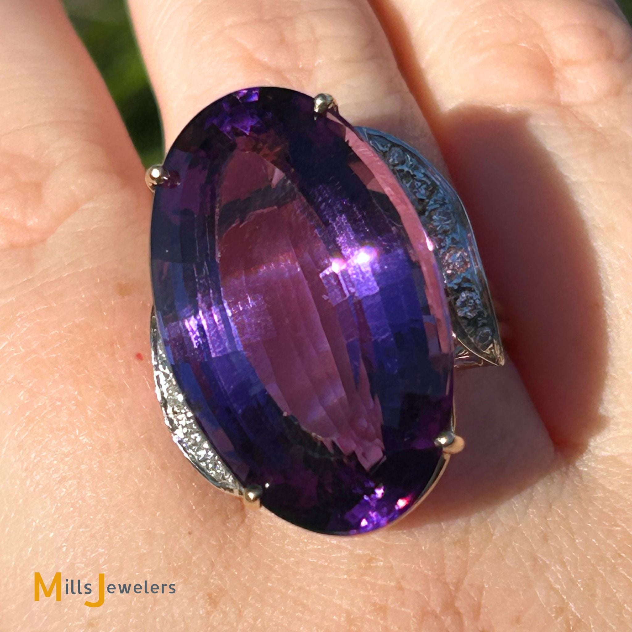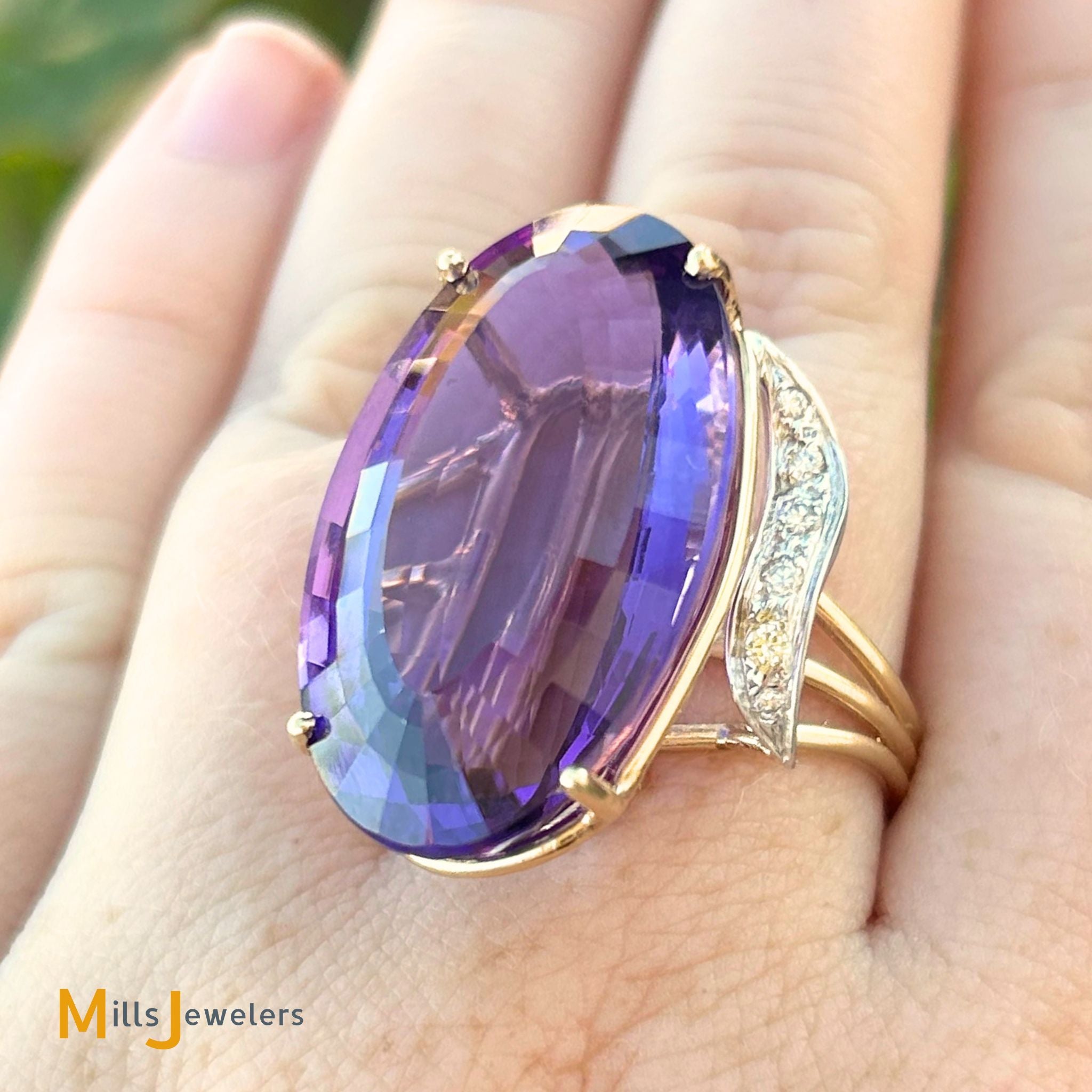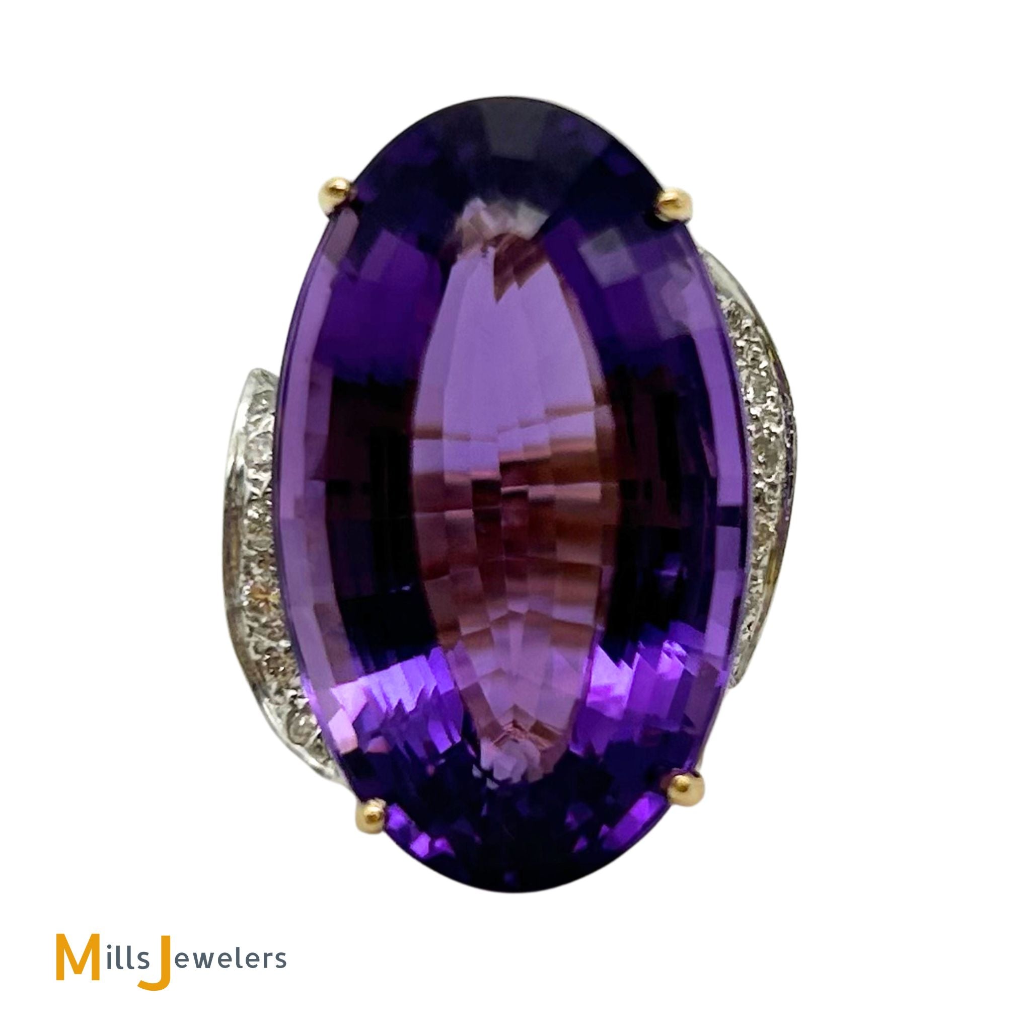 14K Two-Tone Yellow and White Gold Oval-Shaped 29ct Amethyst and 0.36ctw Diamond Cocktail Ring Size 8.25