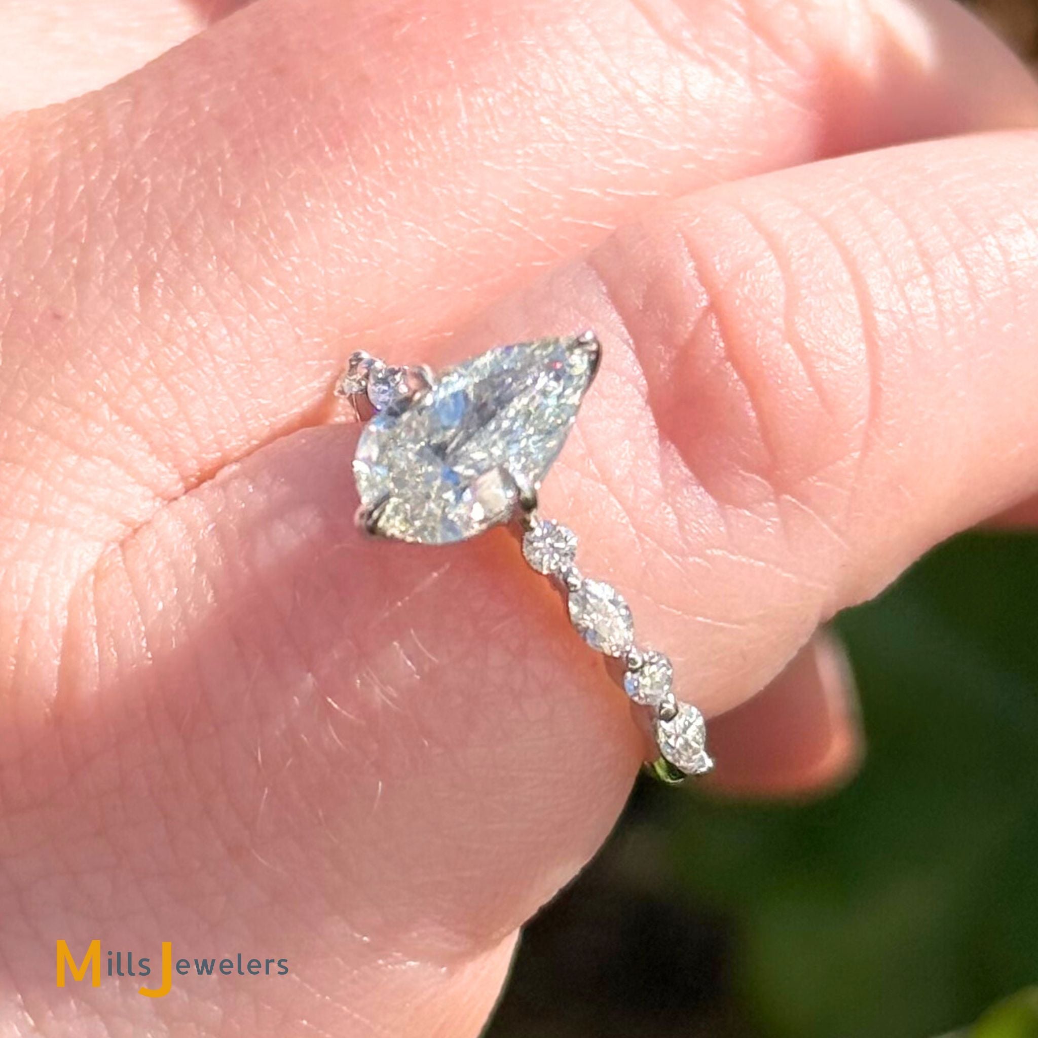 • 1 pear brilliant cut natural diamond 8.96mm x 5.77mm x 3.64mm, 1.19ct, J color, SI2 clarity (GIA certified)