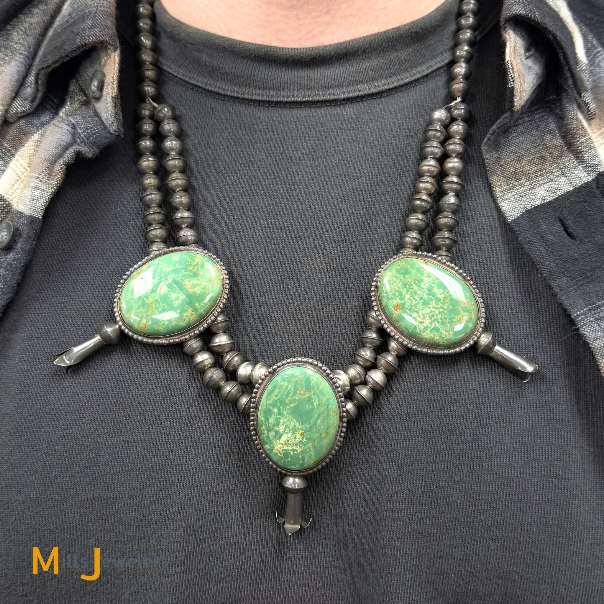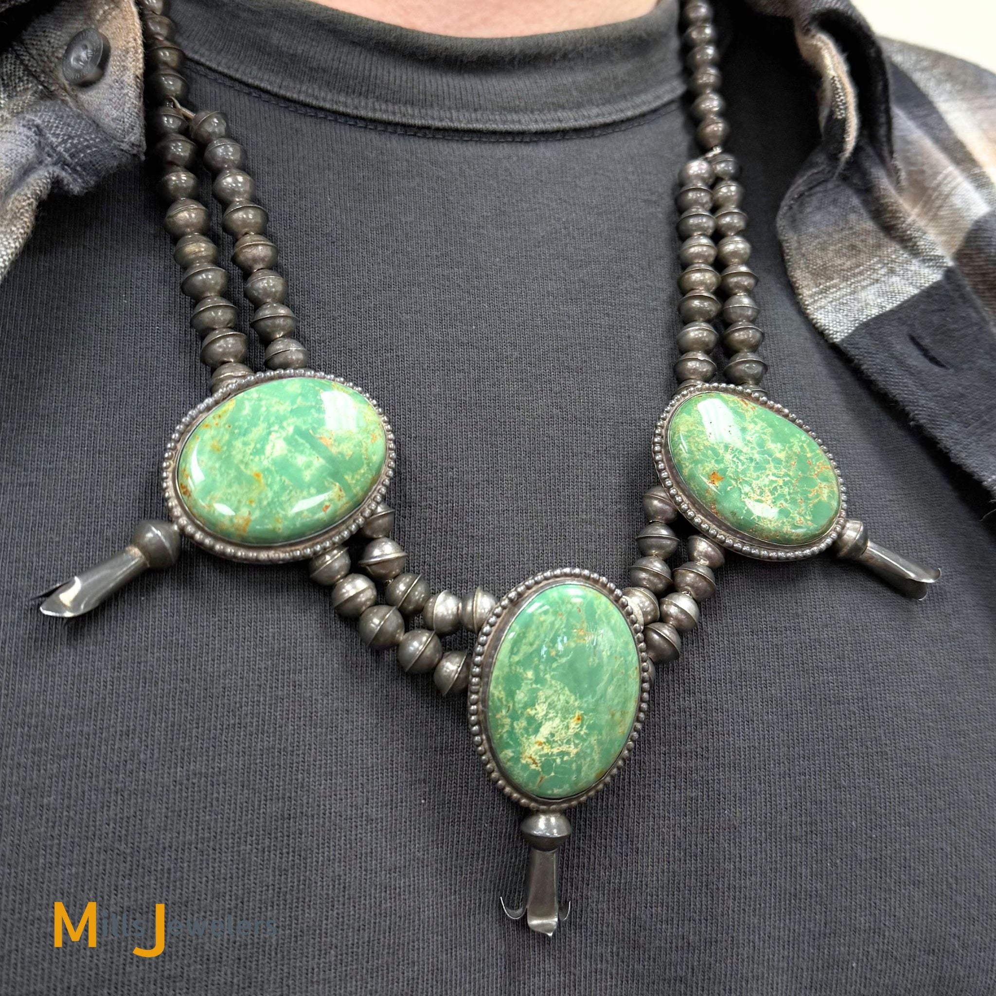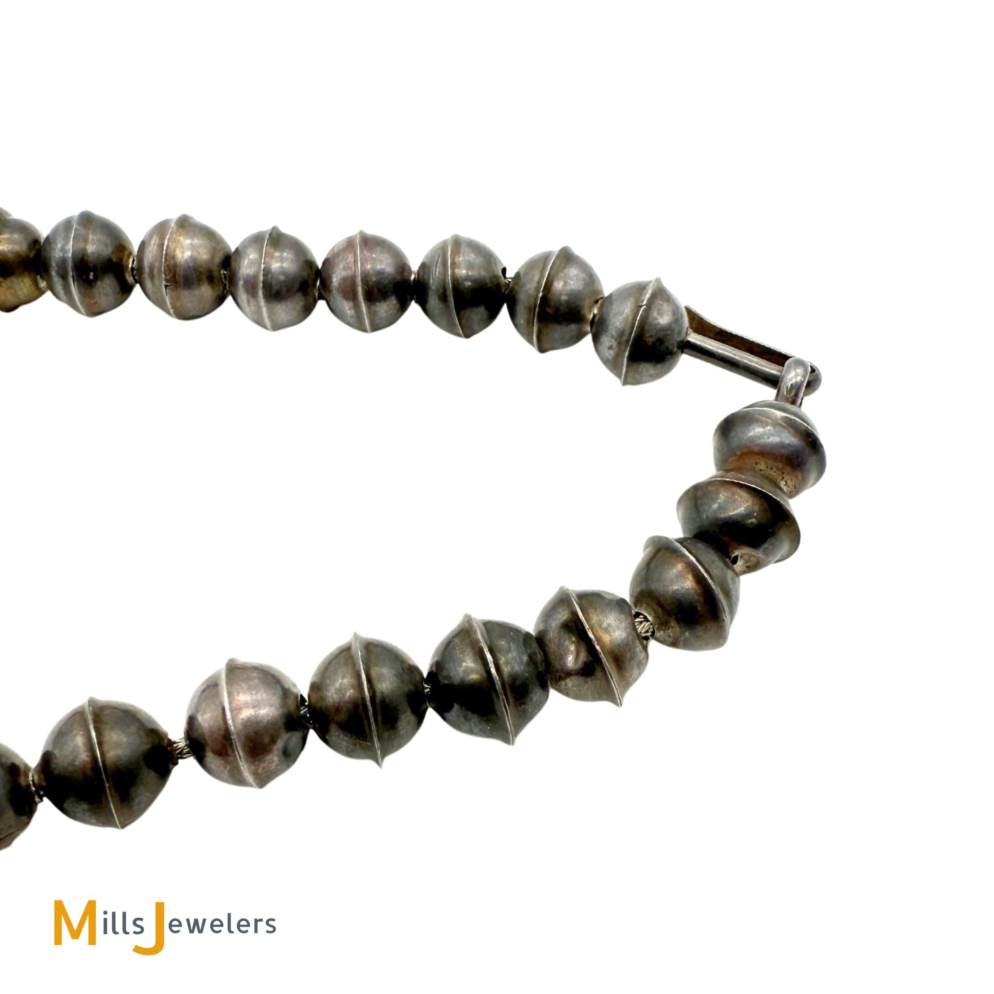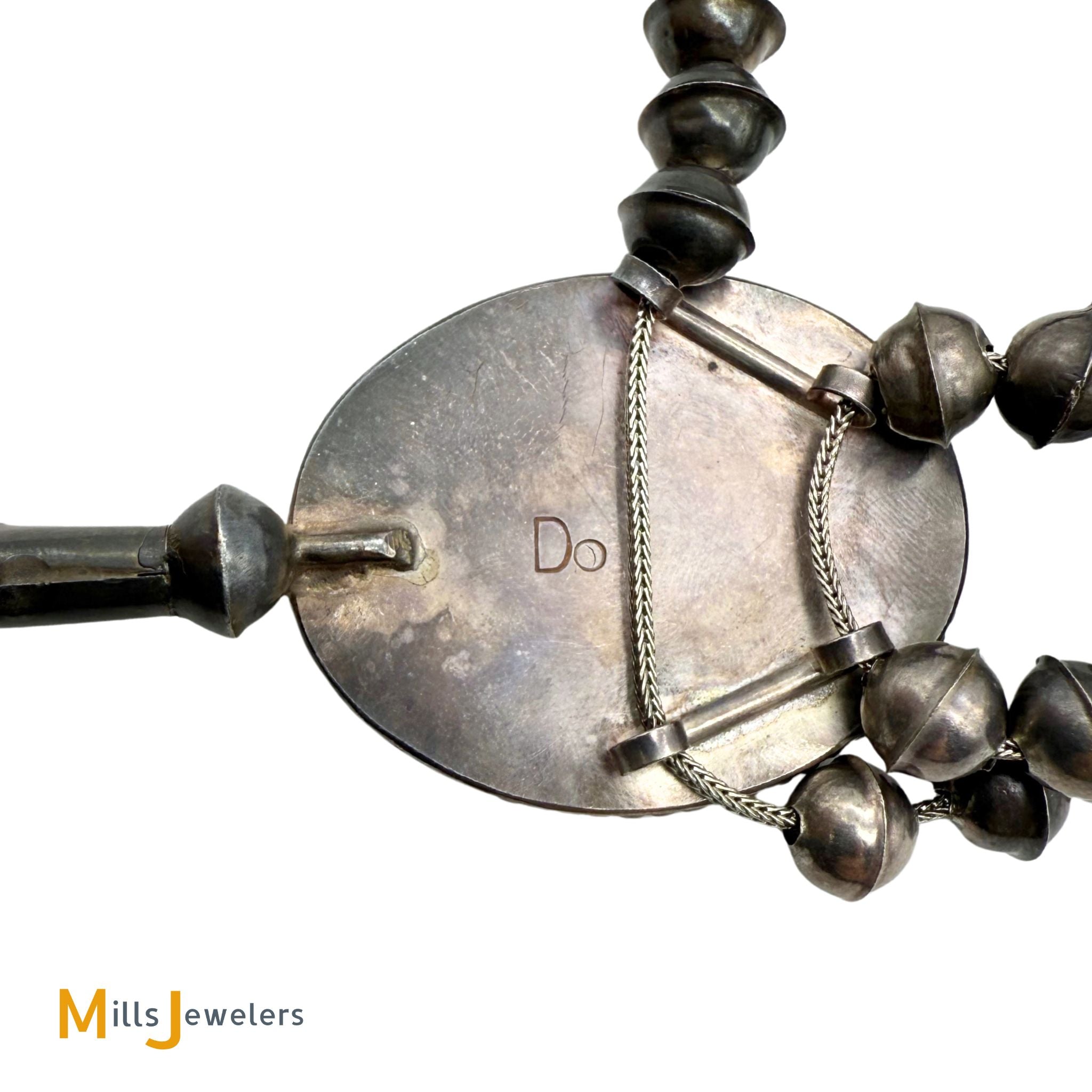 - Overall good vintage condition, heavy scratching and moderate pitting throughout. Heavy natural patina from age. One turquoise shifts slightly in its bezel. Some silver beads have deformation and mild denting.