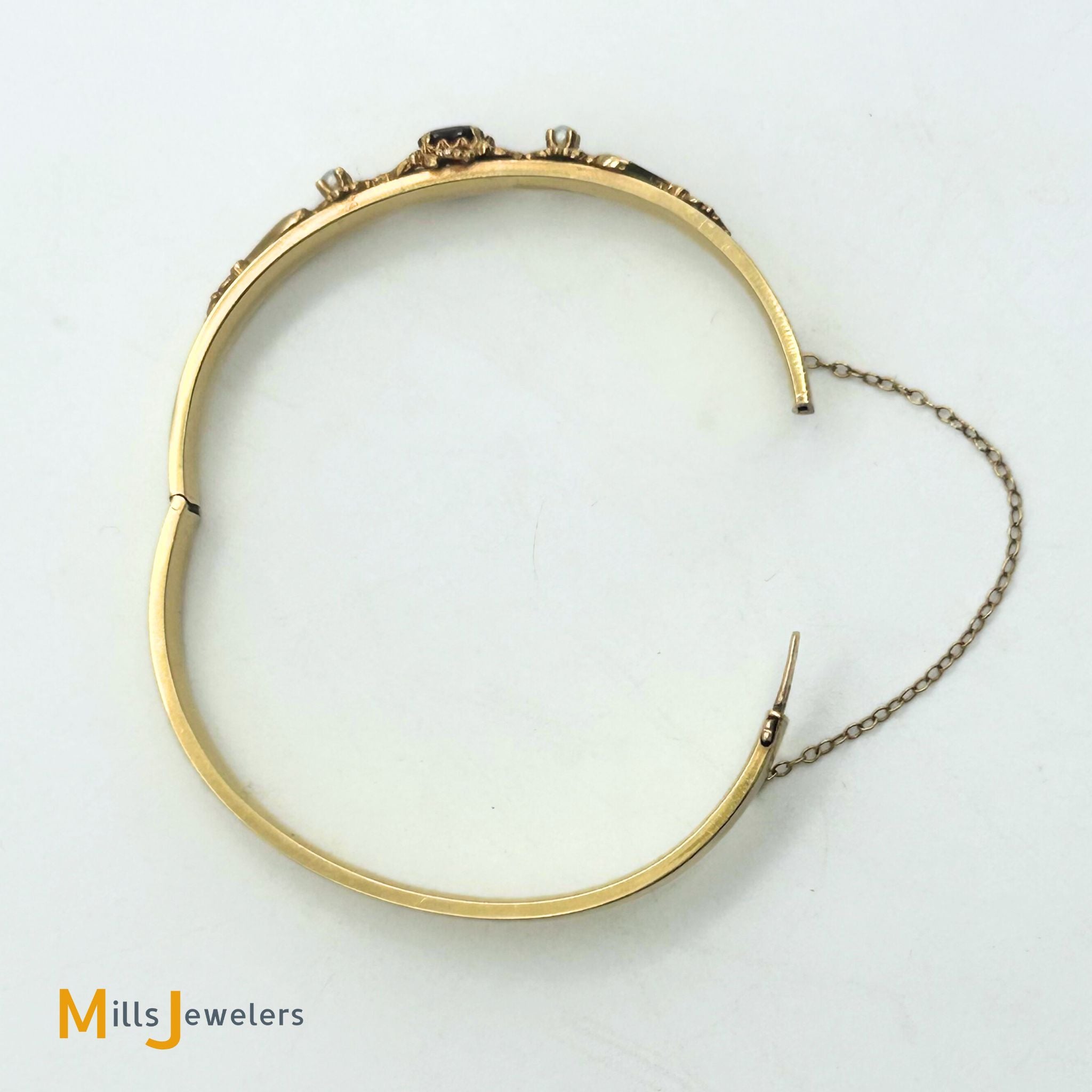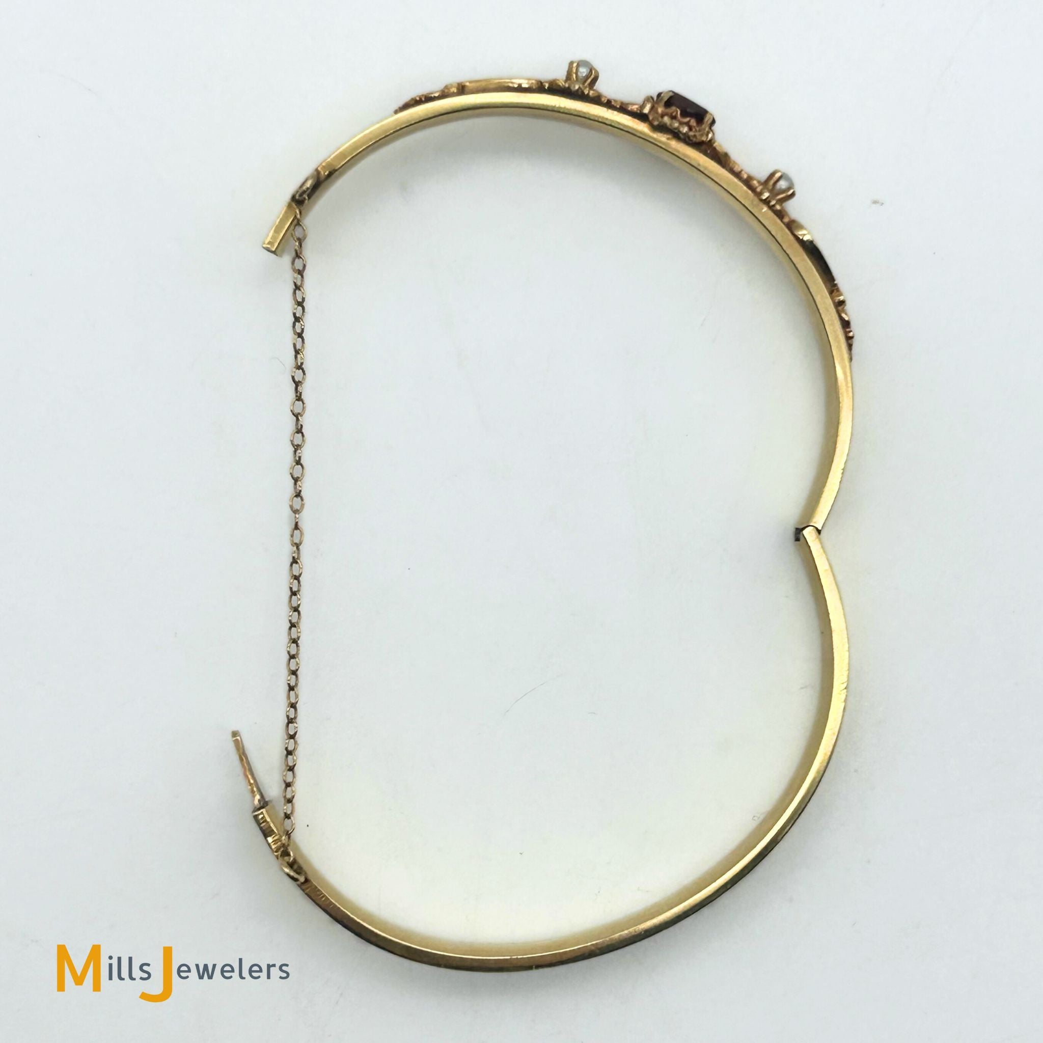 14K Yellow Gold Garnet and Seed Pearl Hinged Bangle Bracelet