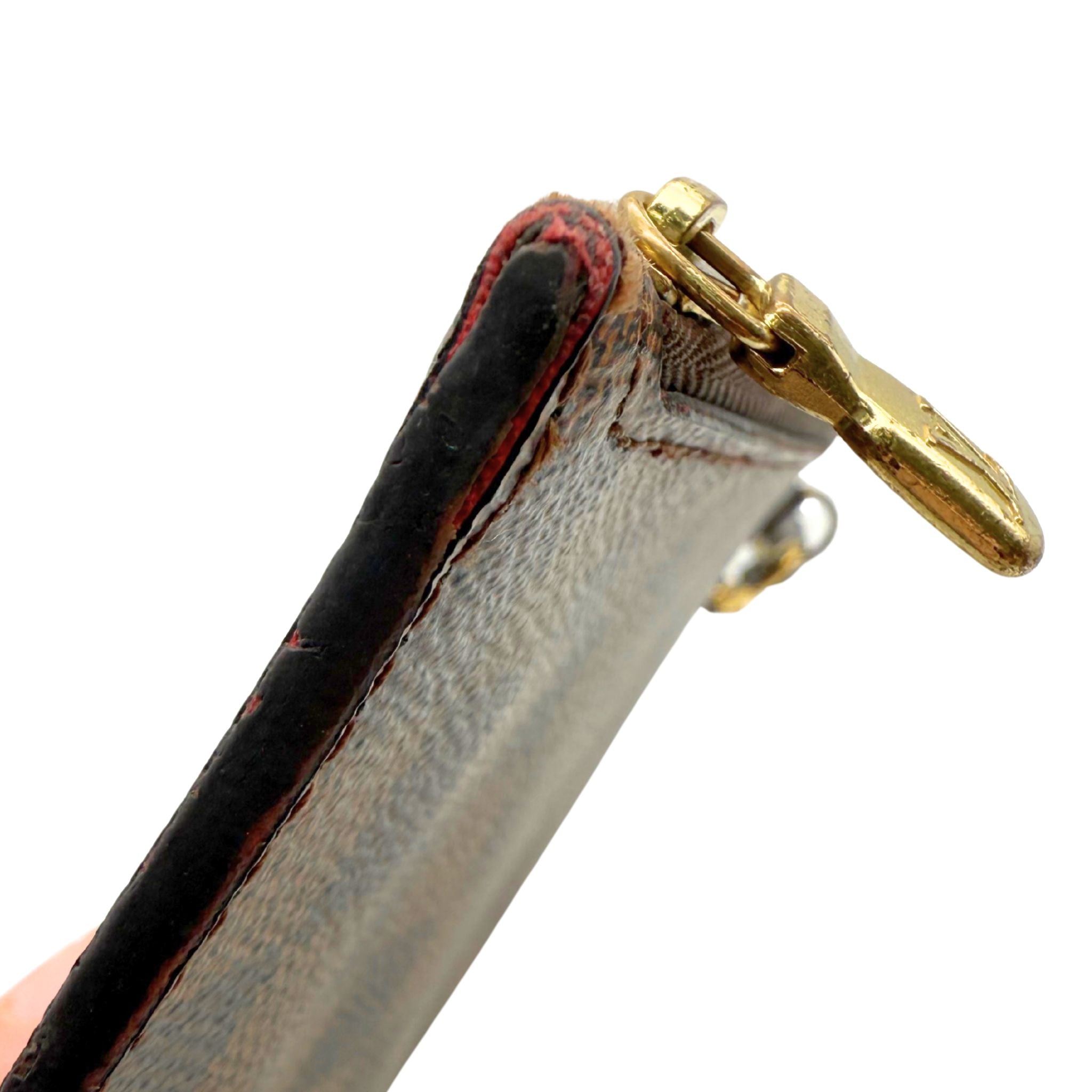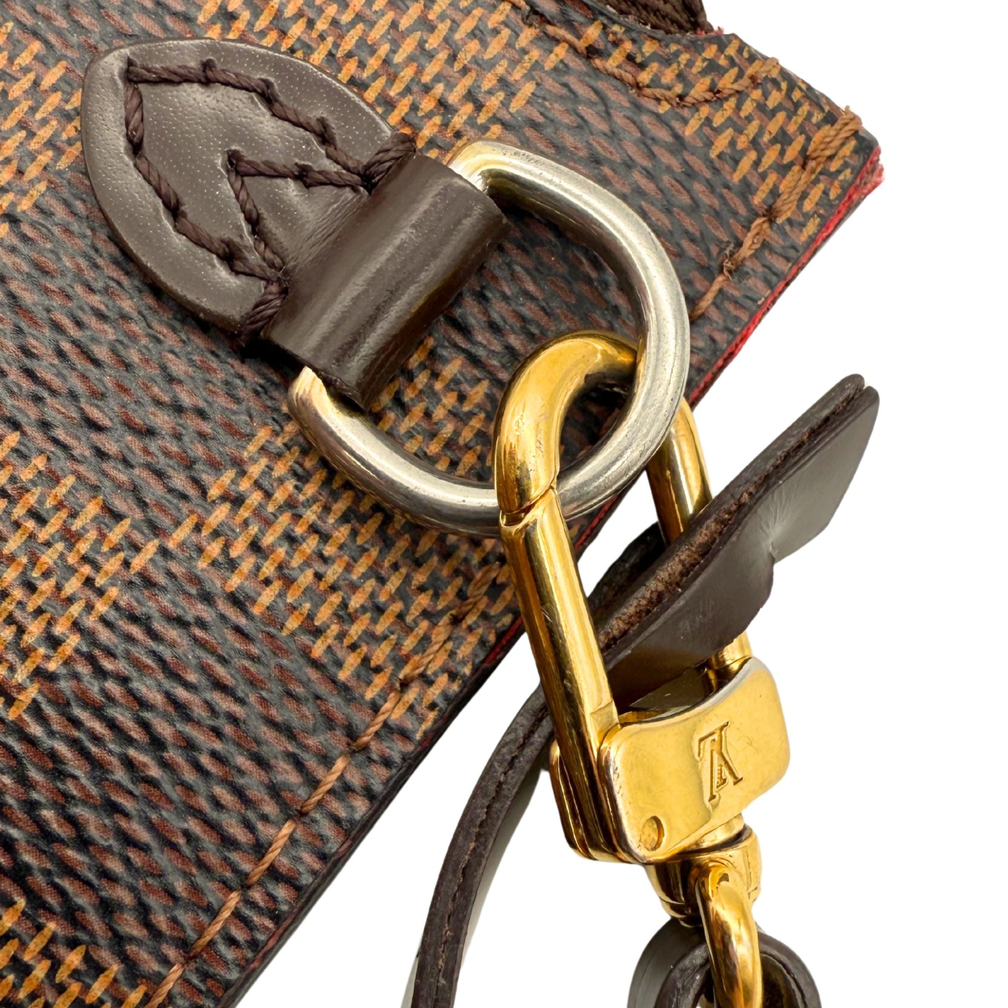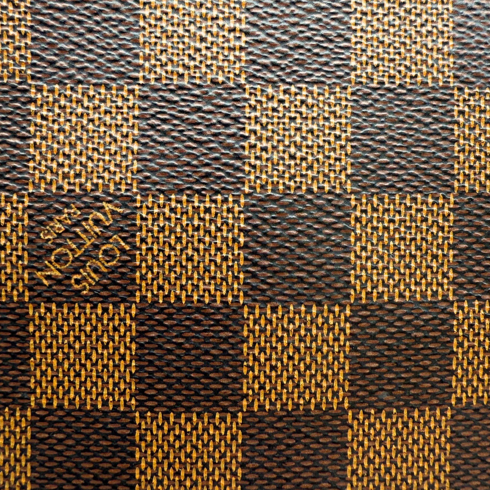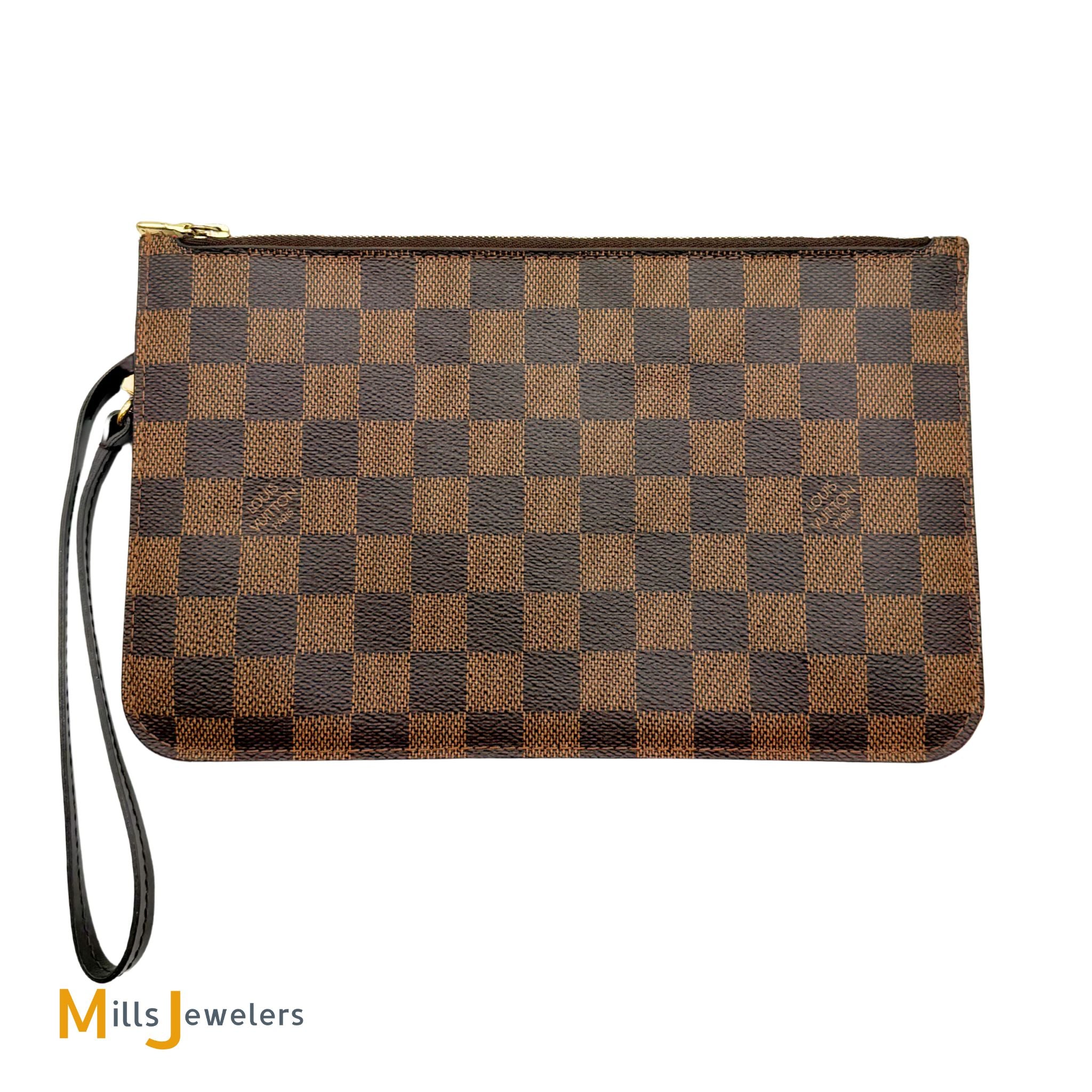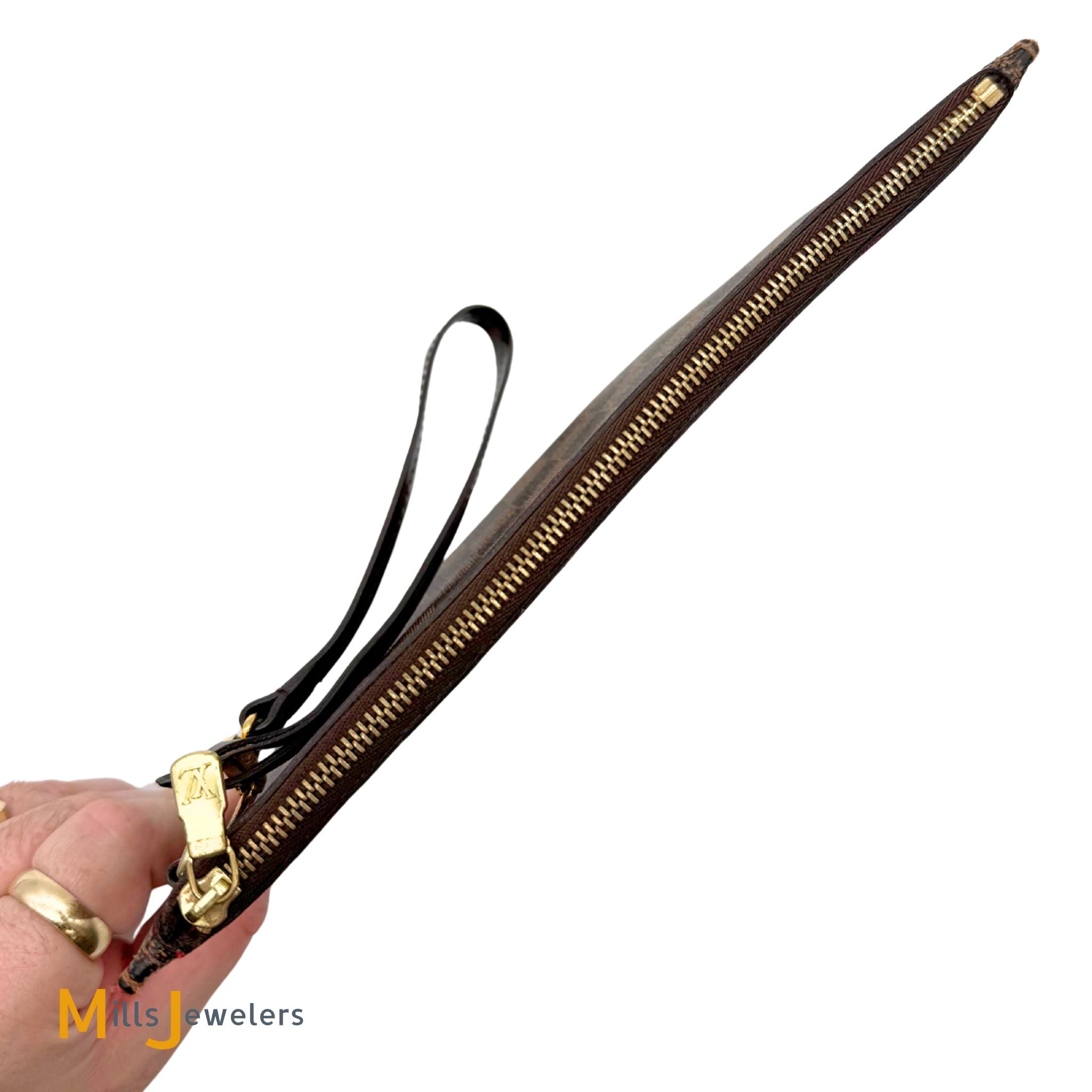 - Exterior: Brown damier ebene coated canvas with gold-color zipper closure. D-ring with coated leather wristlet attachable by gold-color LV branded clip.