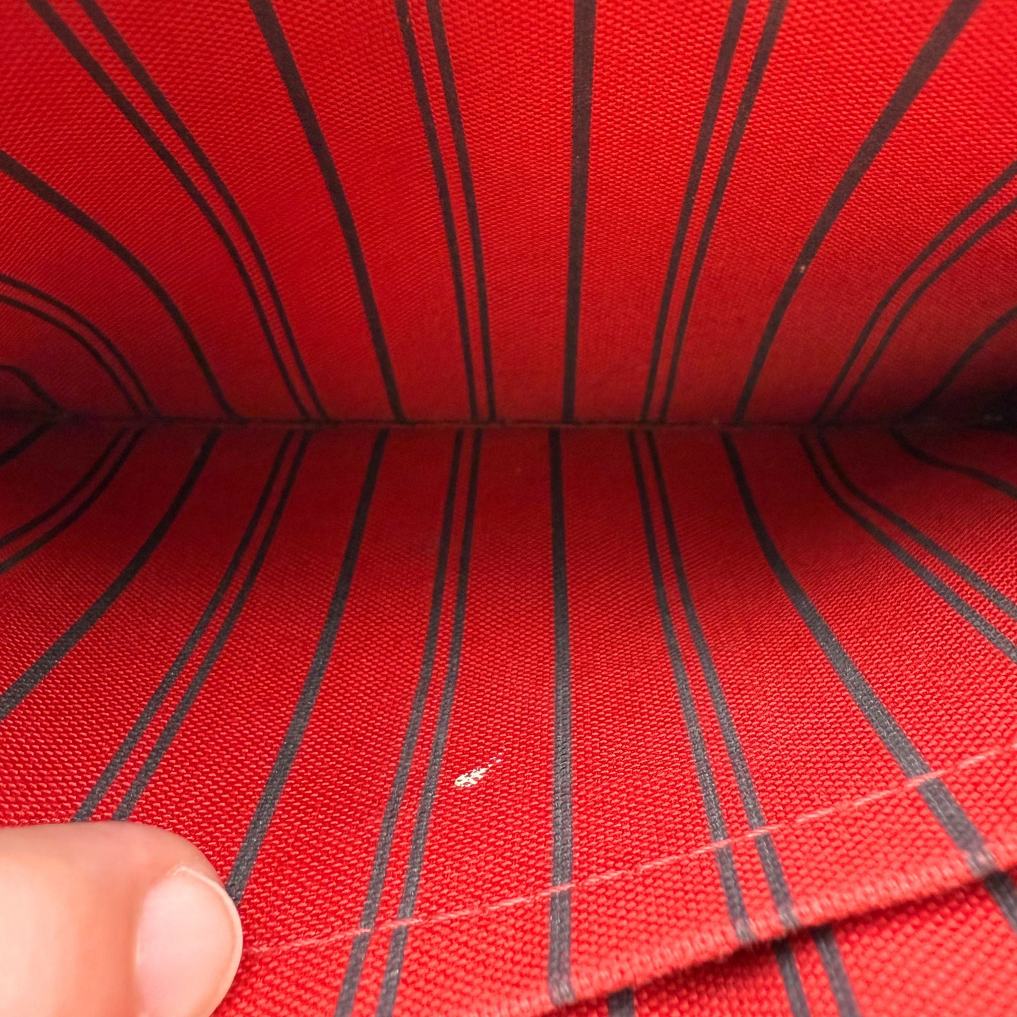 - Interior: Cerise red canvas striped lining with one (1) main open compartment and one (1) open flat pocket with the same lining. Leather branded tag.