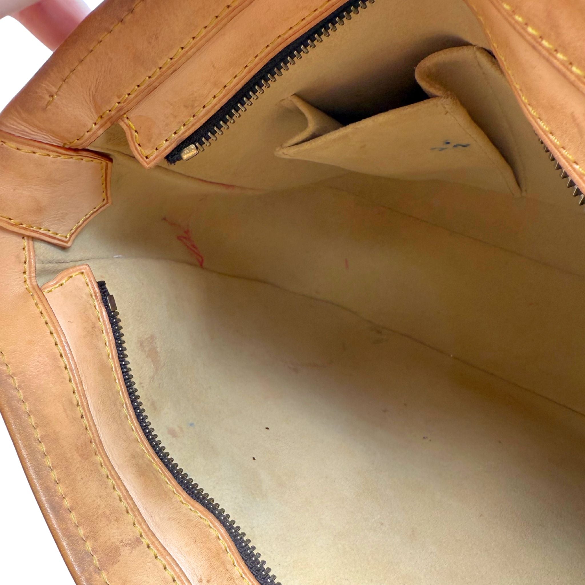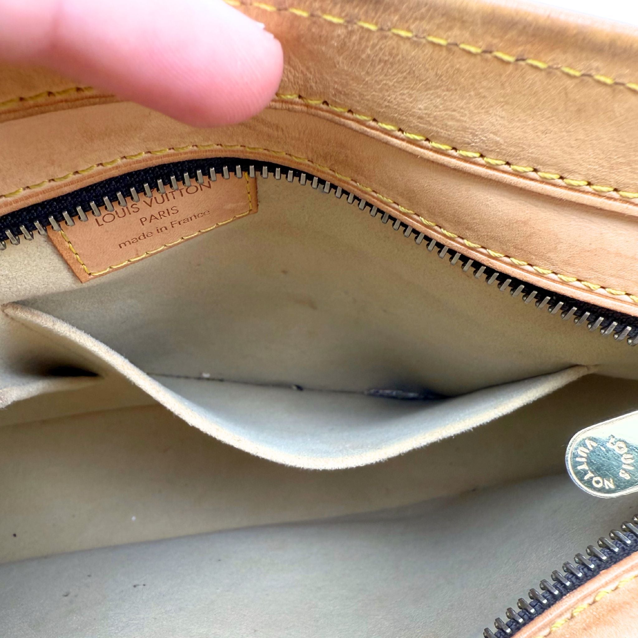 - Exterior: Louis Vuitton Monogram coated canvas with cowhide leather trim. Gold-color top zipper and buckles for the detachable/adjustable strap. One (1) detachable and adjustable cowhide leather shoulder strap. Two (2) clip closure pockets with tan microfiber suede lining. One (1) flat zippered pocket on the front.