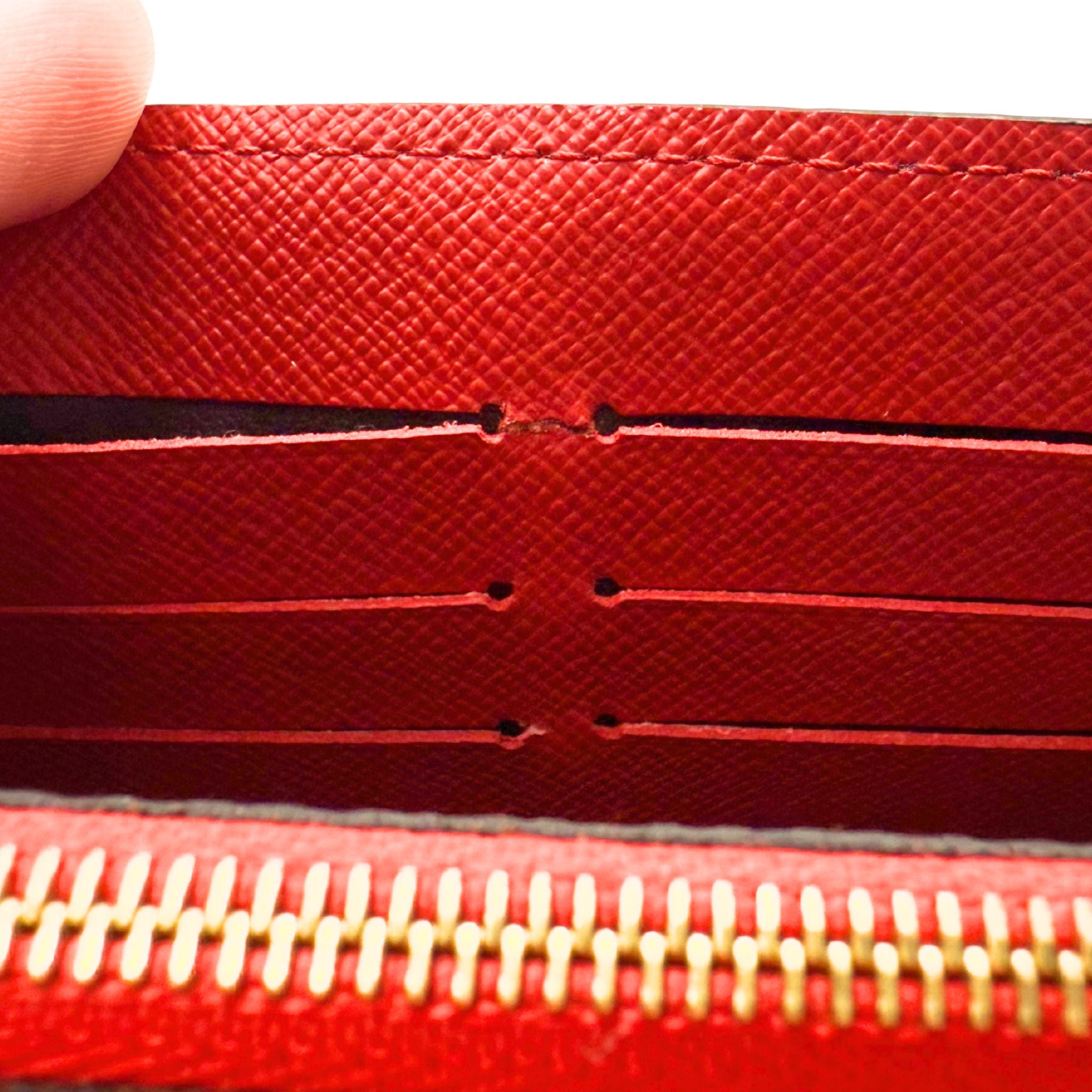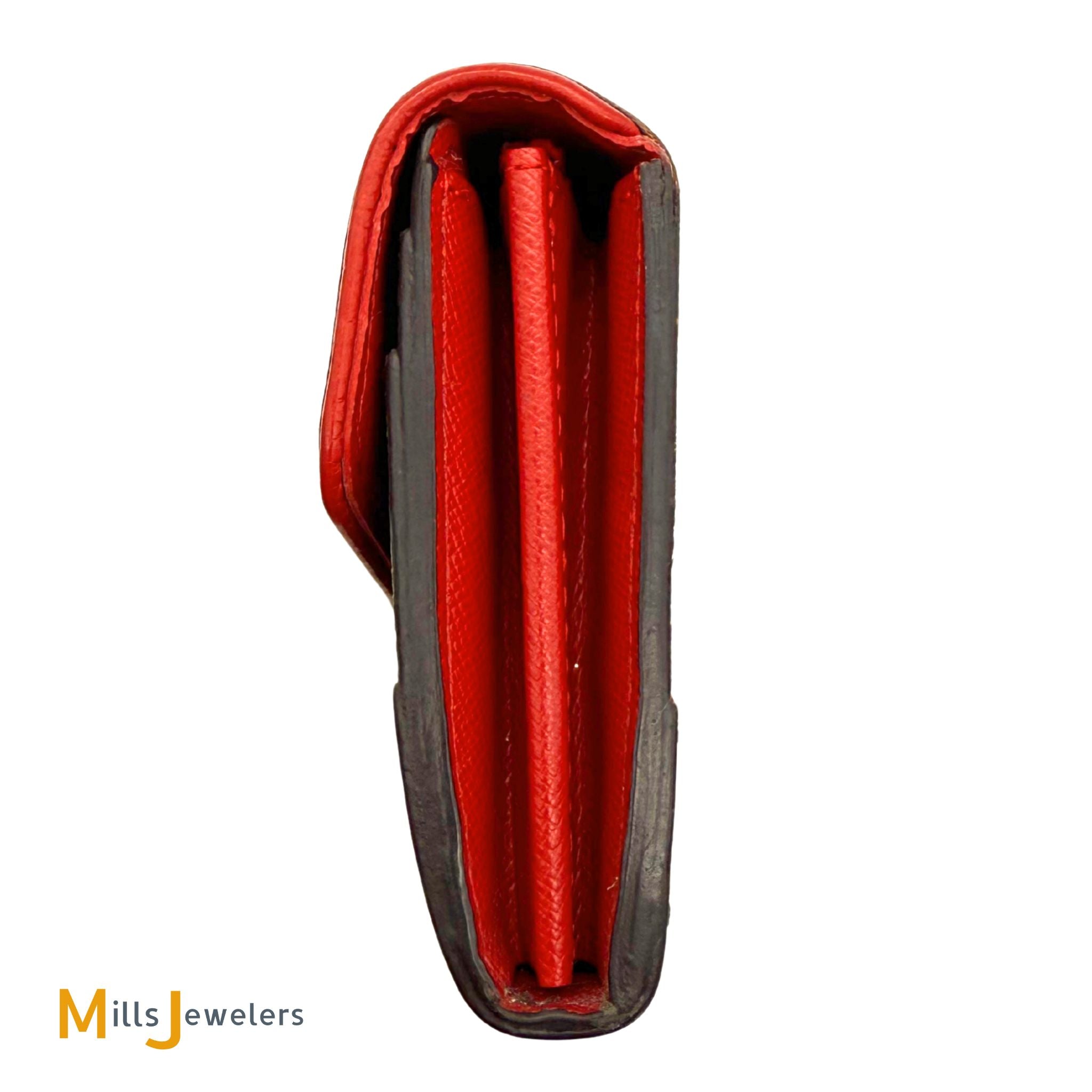 - Interior: Red grained cowhide leather lining with one (1) zippered middle pocket with smooth red leather lining, twelve (12) card slots, one (1) flat pocket towards the back of the wallet.