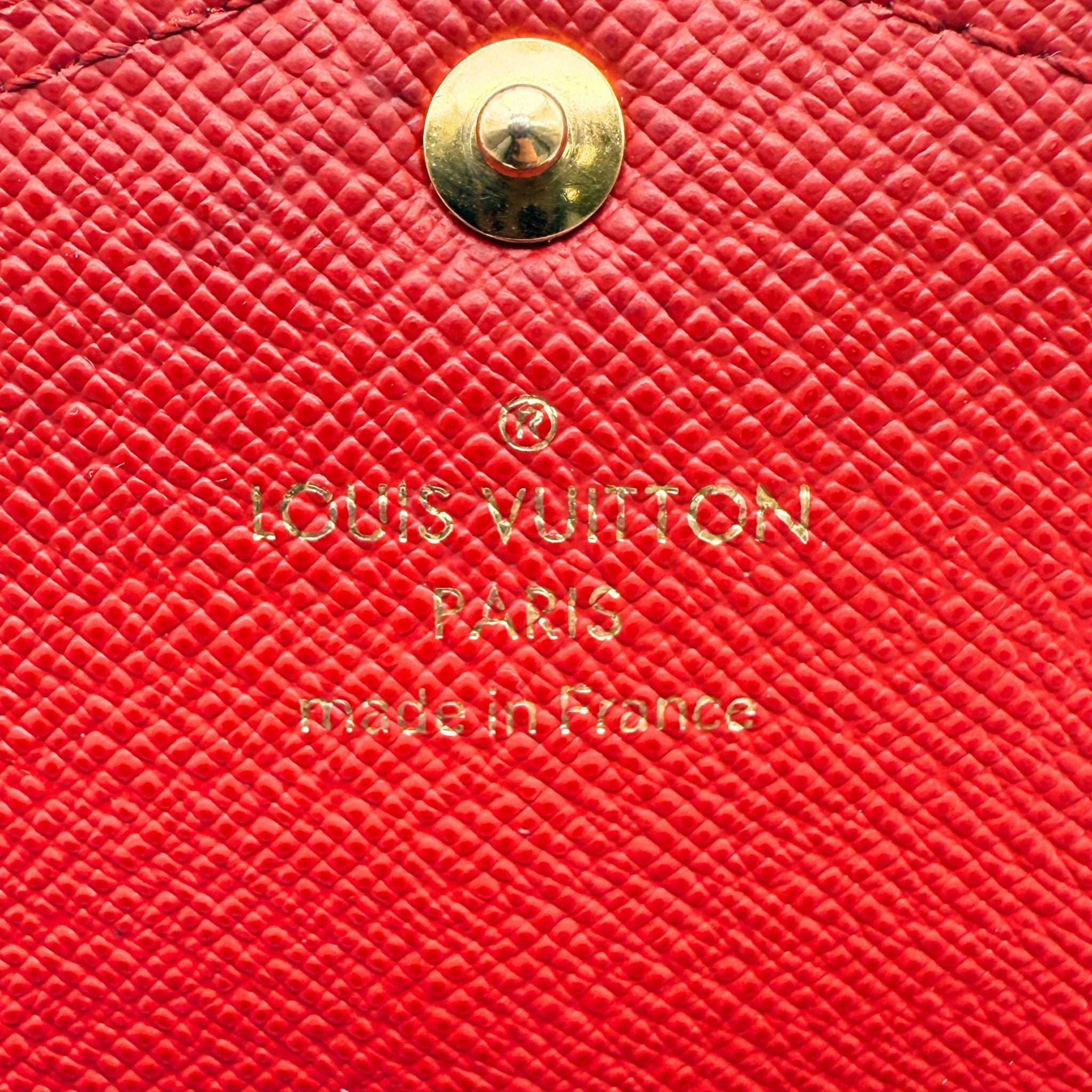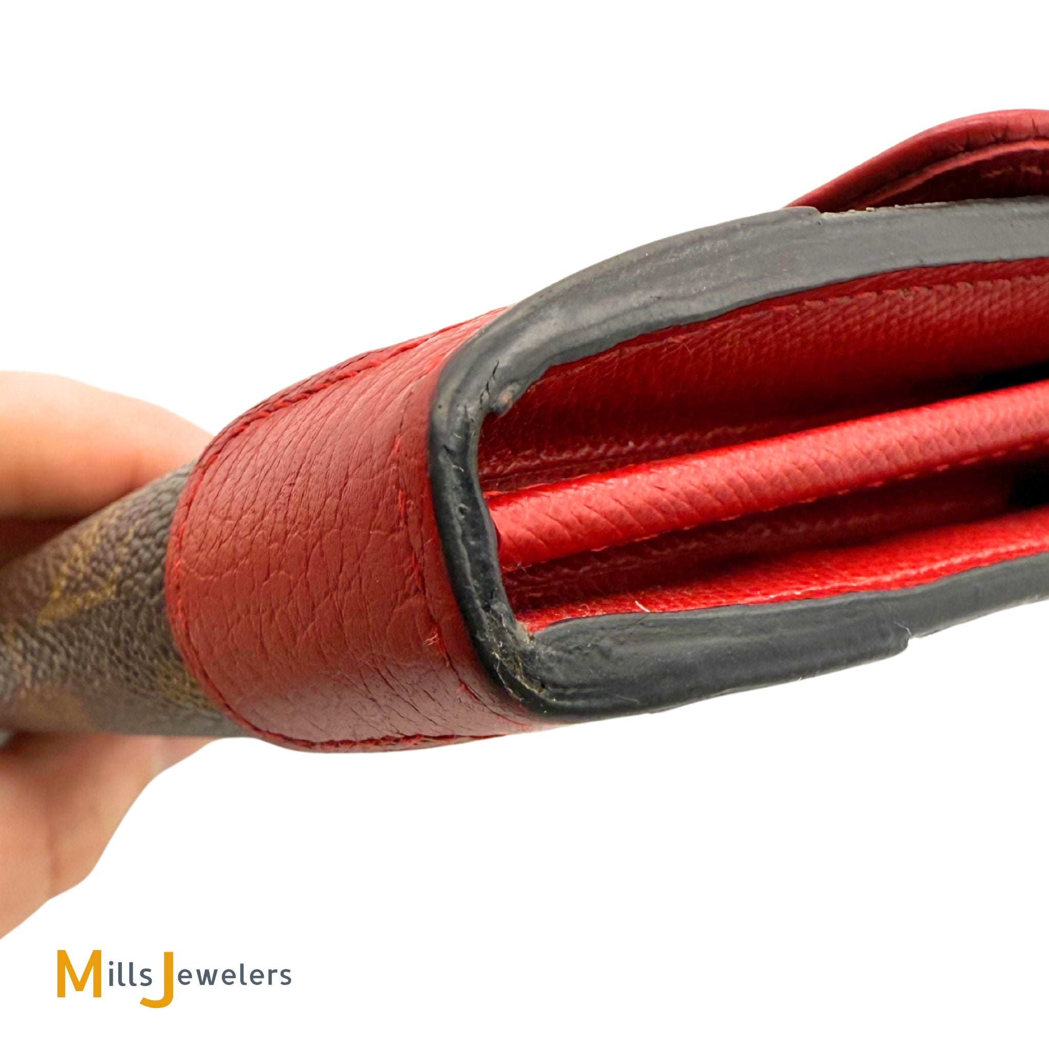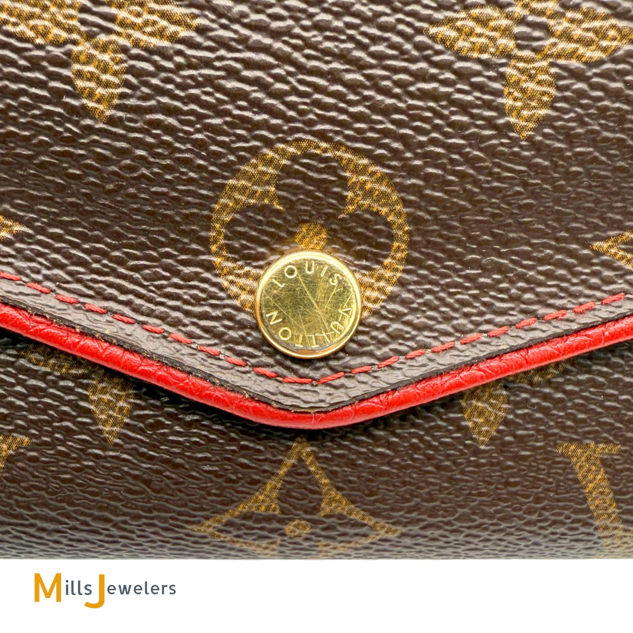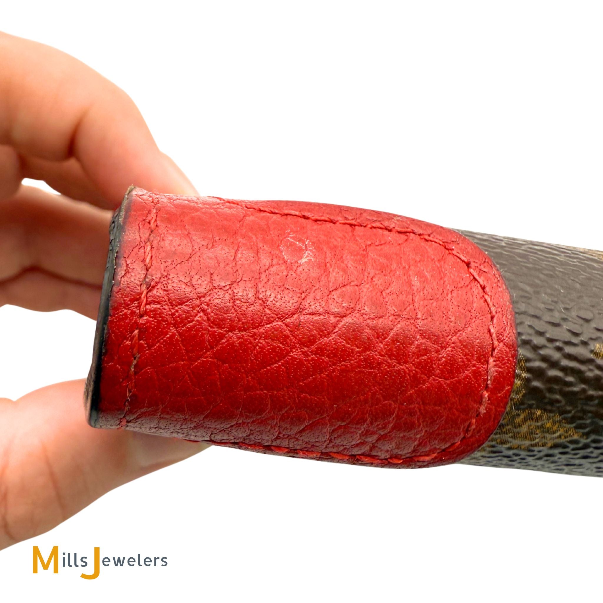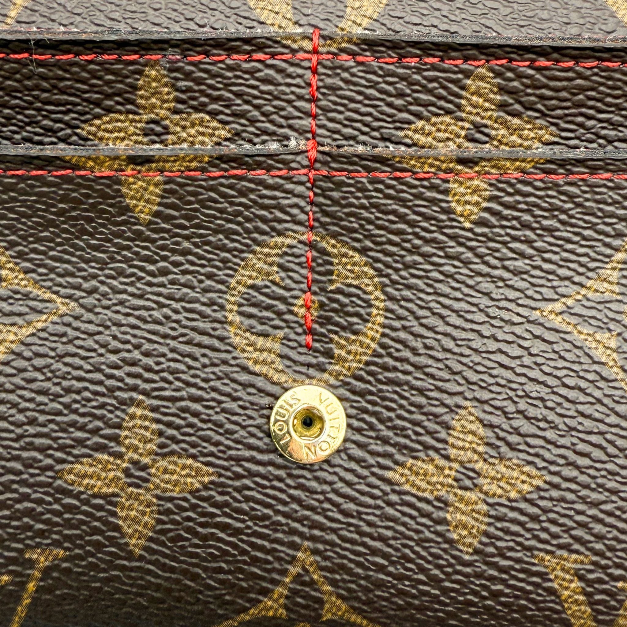- Exterior: Brown monogram coated canvas with gold-color button snap closure on front flap. Red cowhide leather trim along the opening and corners. Red cotton stitching throughout. Four (4) open card slots underneath the snap closure.