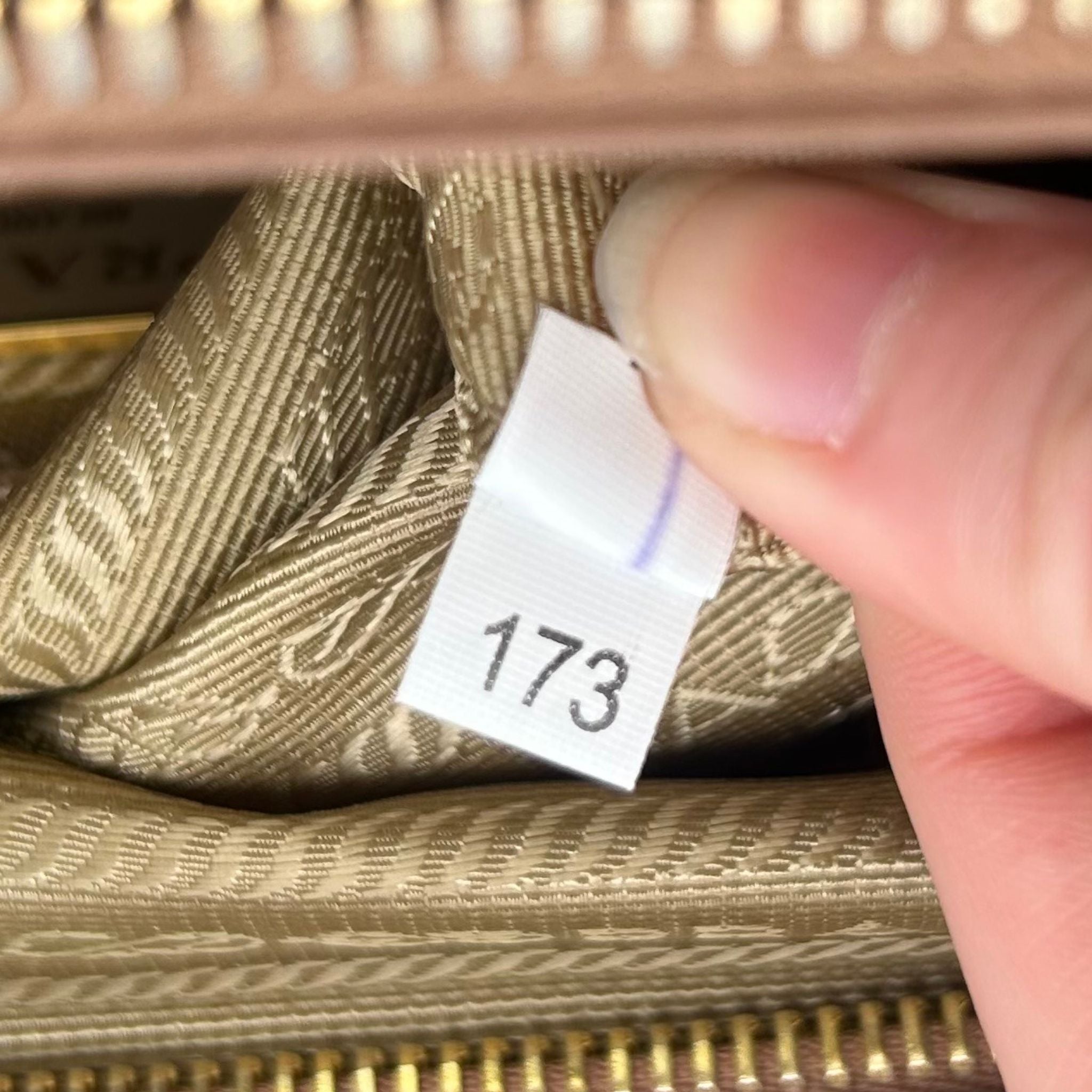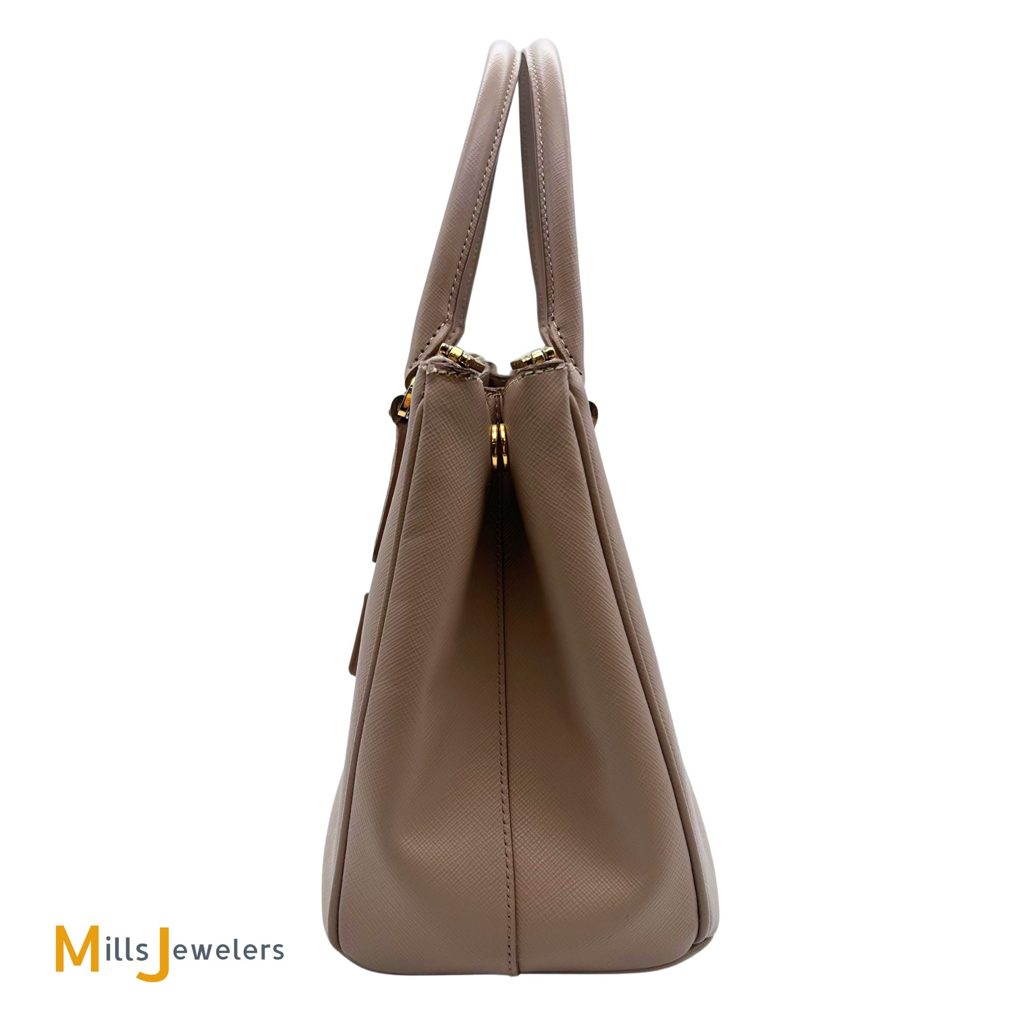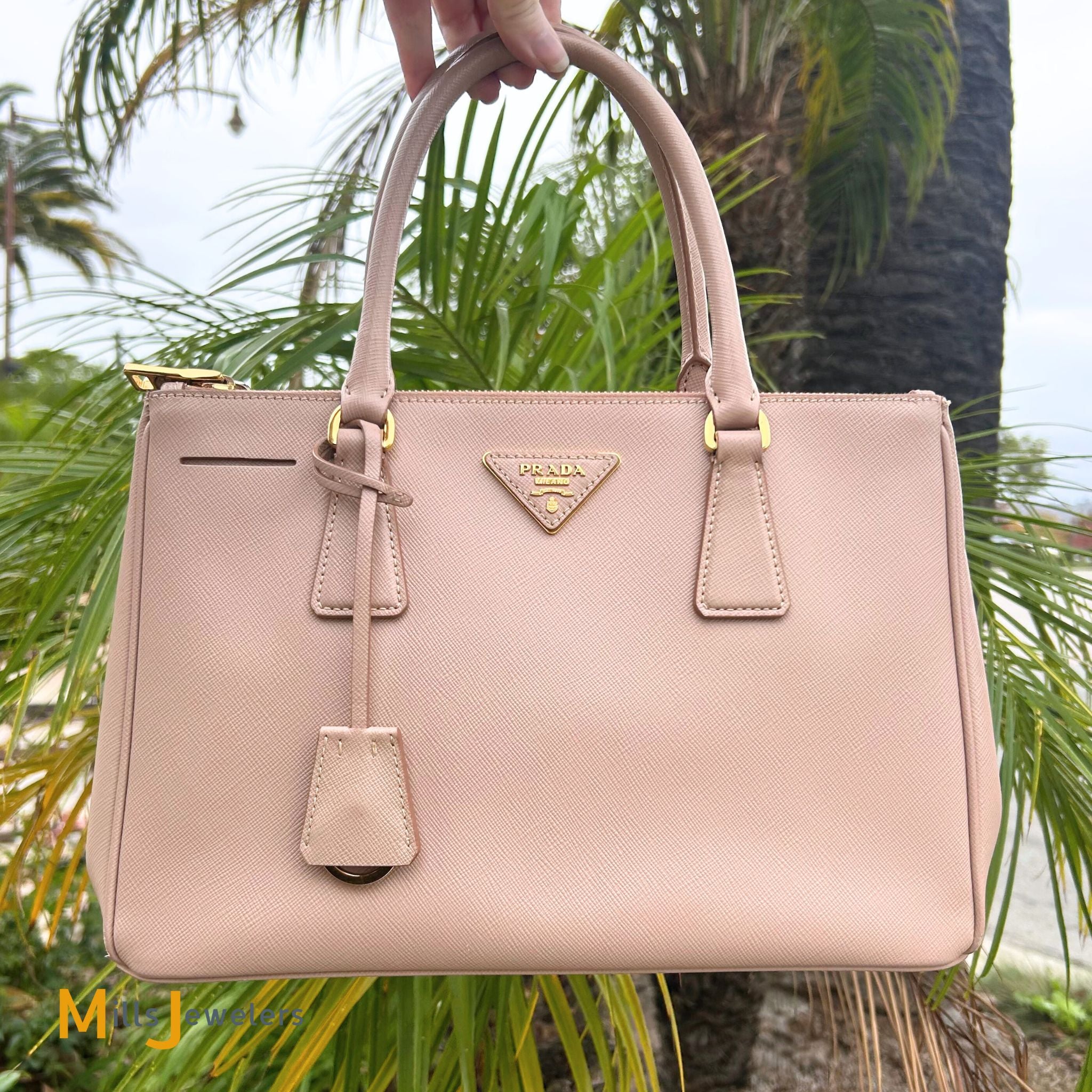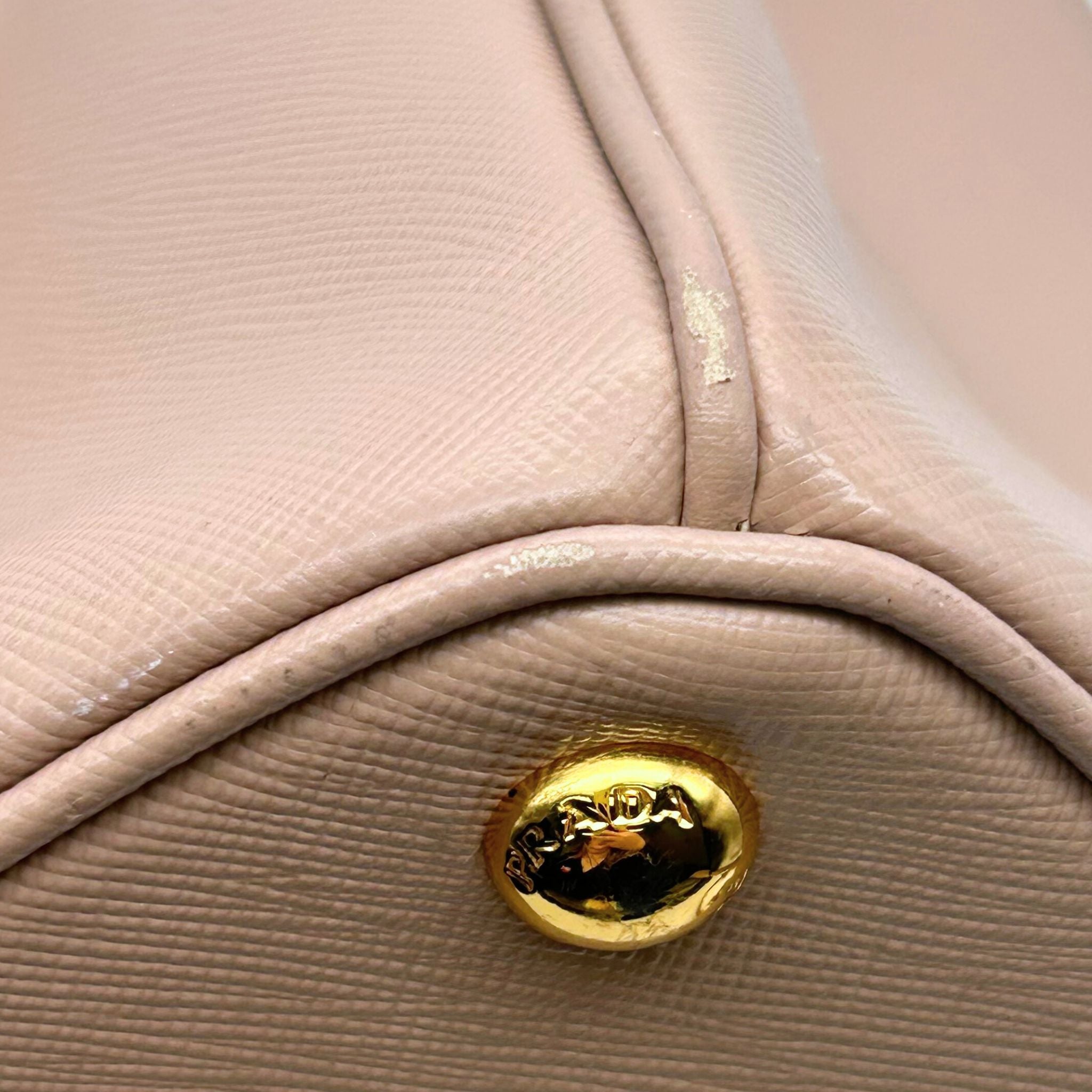 This PRADA Saffiano Leather Galleria Lux Crossbody Handbag in Cammeo Pink is a crossbody handbag tote that features a double-zip closure and two snaps along the side of the bag which makes the bag changeable in size.