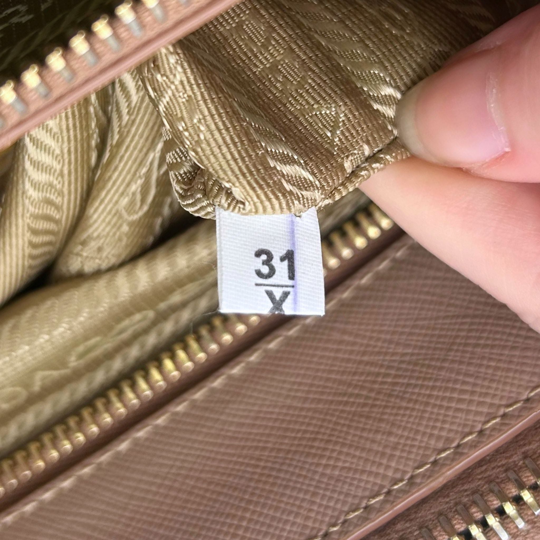 • Exterior: Saffiano leather in cammeo pink features two (2) top handles, one (1) leather clochette and double zip closure
