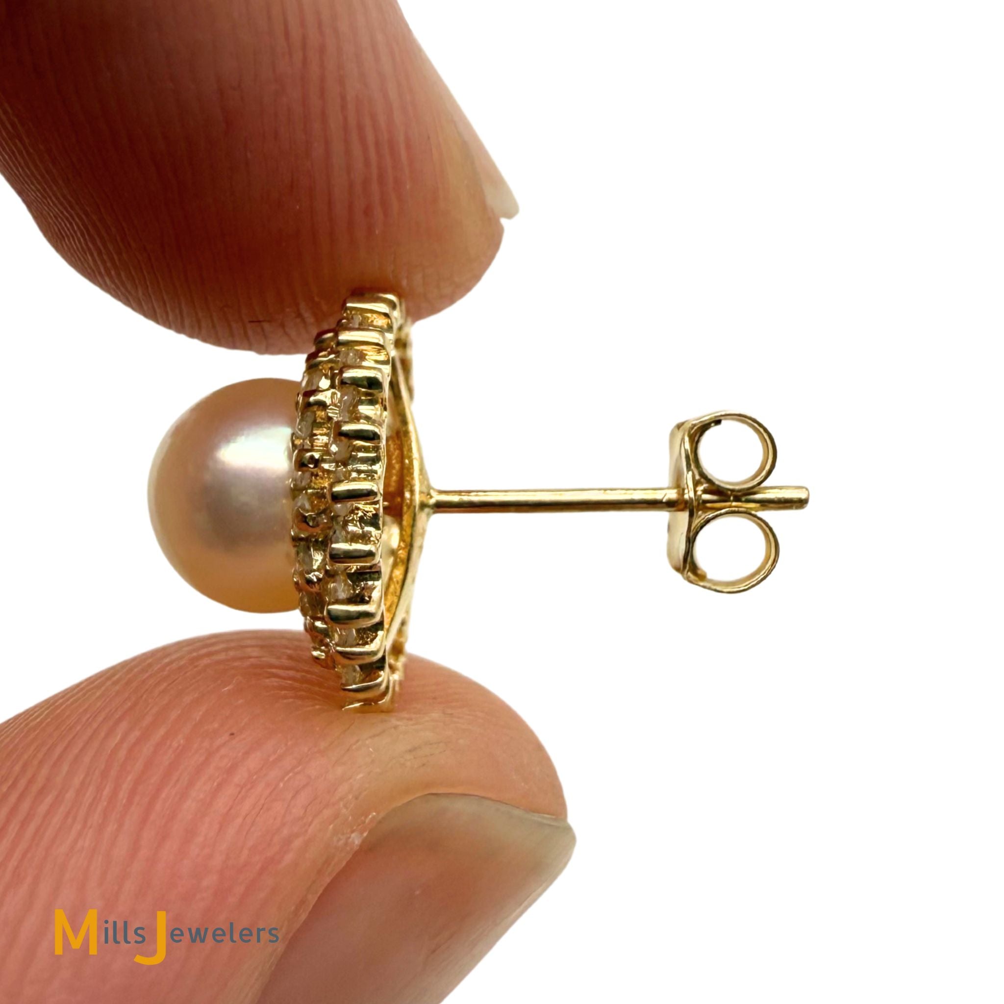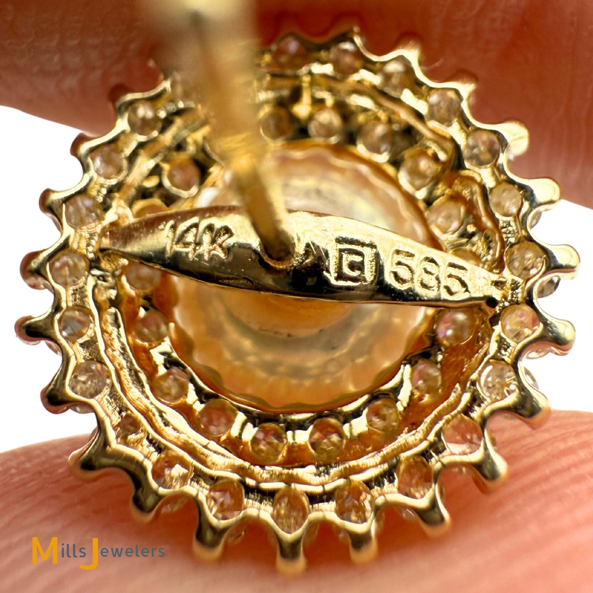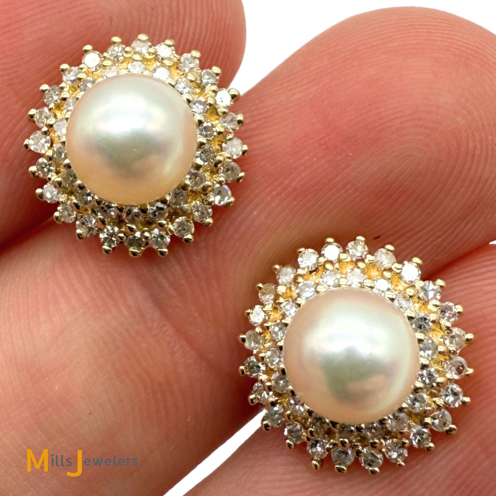 Signed 14K Yellow Gold Pearl and 0.42ctw Diamond Double Halo Post Earrings