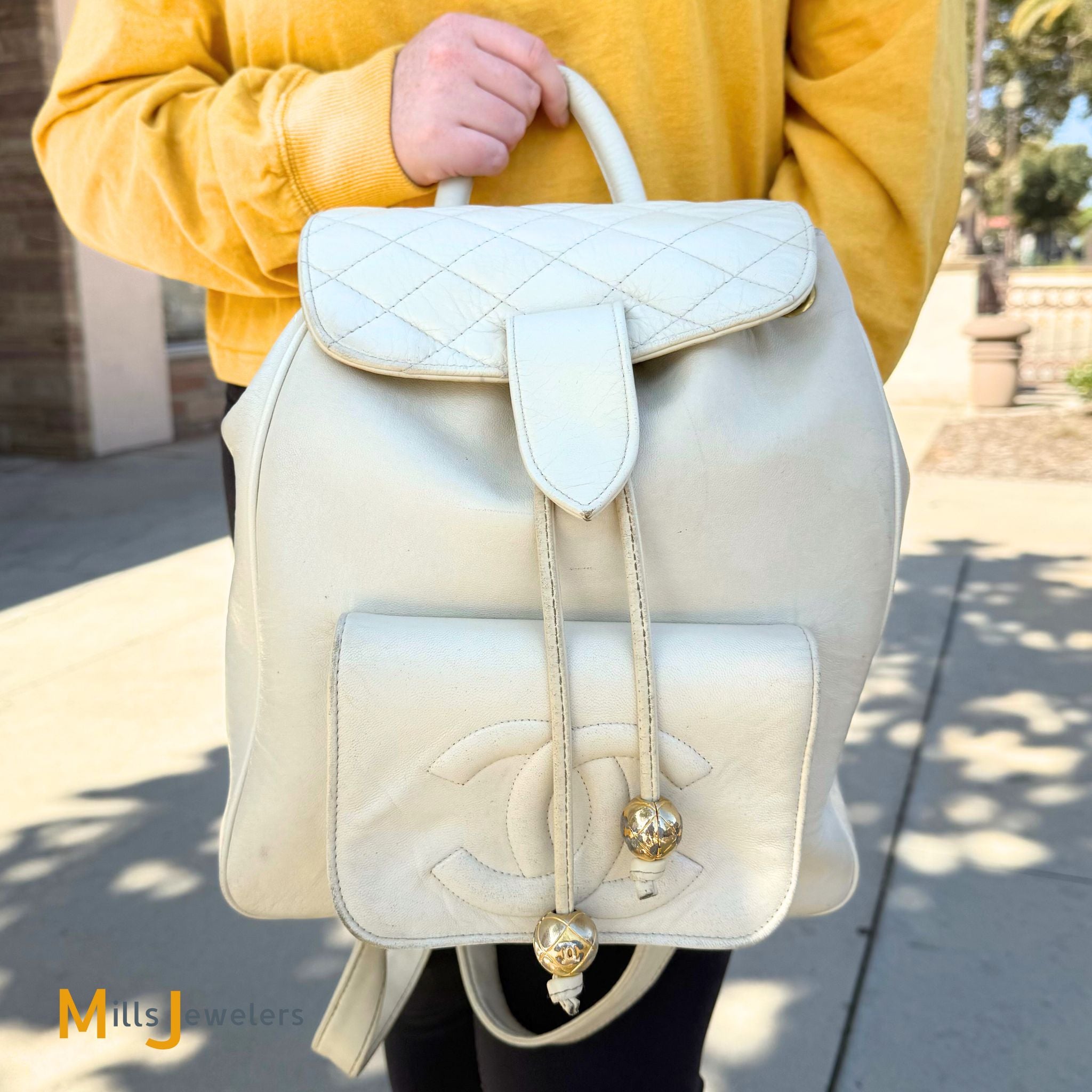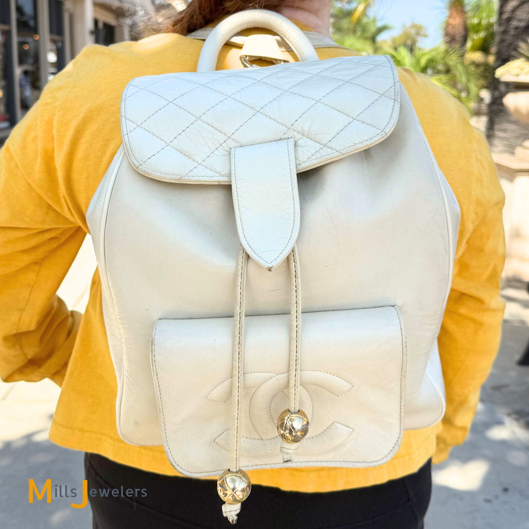 - Exterior: Soft cream-colored lambskin leather throughout with one (1) quilted magnetic flap. Leather backpack straps are attached by gold-color hardware and are non removeable or adjustable. Features drawstrings accented with Chanel double C gold-color brass balls. One (1) zippered outside pocket lined with soft lambskin leather and a stitched Chanel double C on the outside.