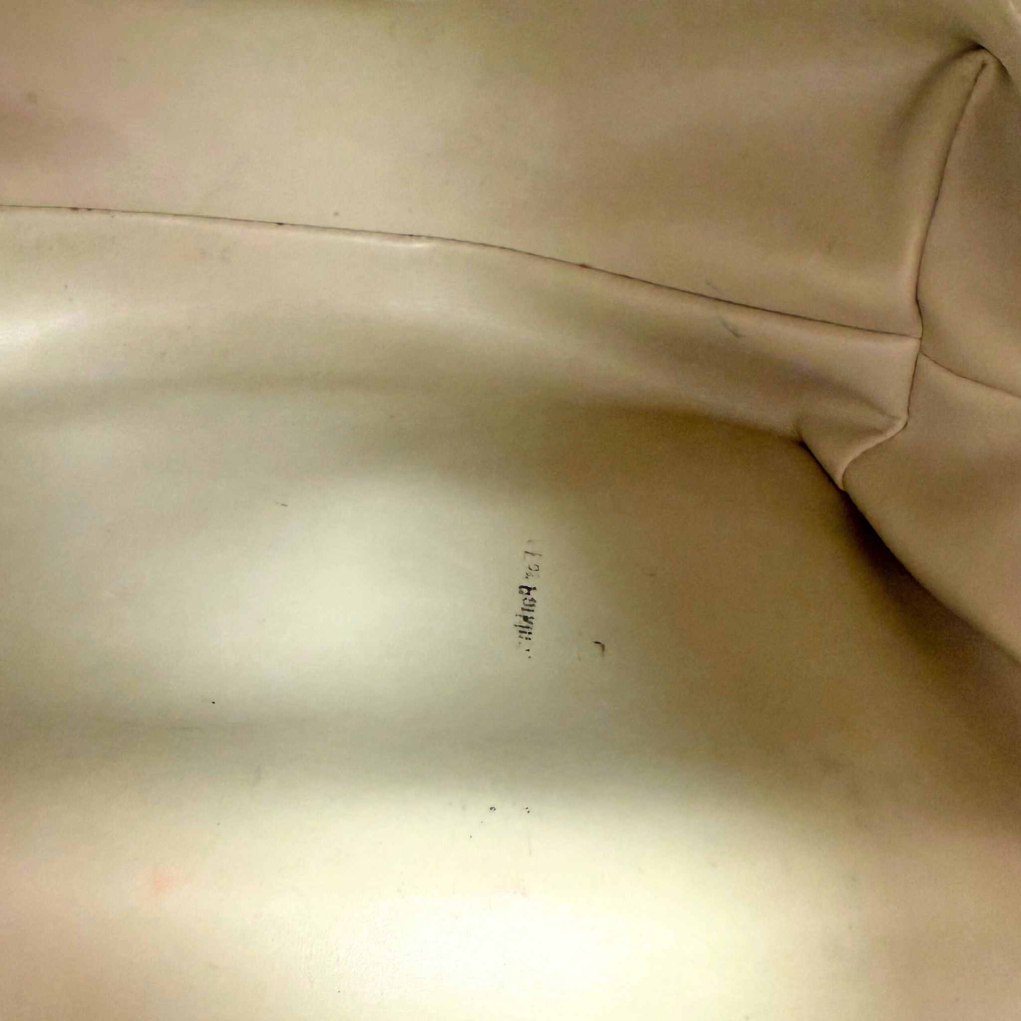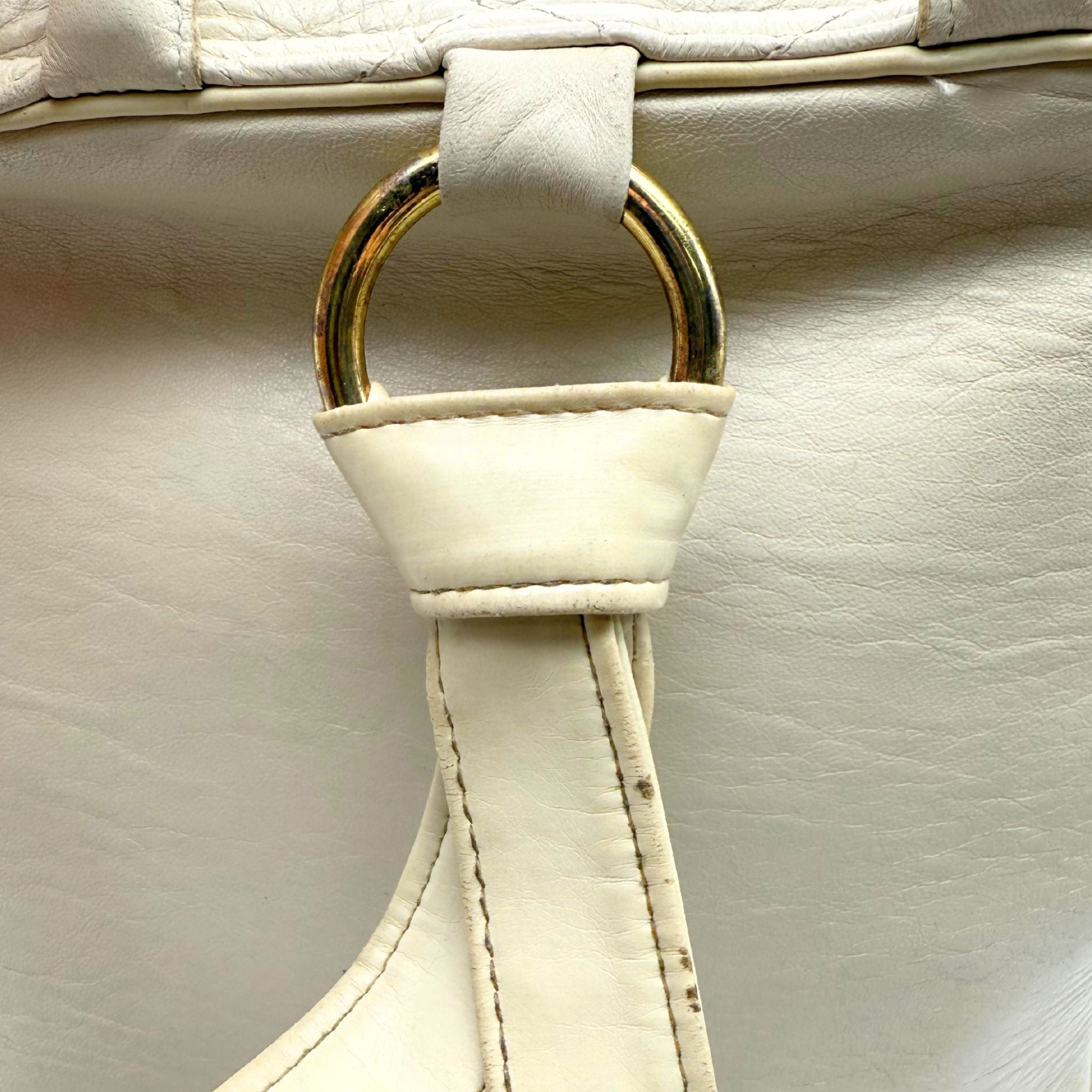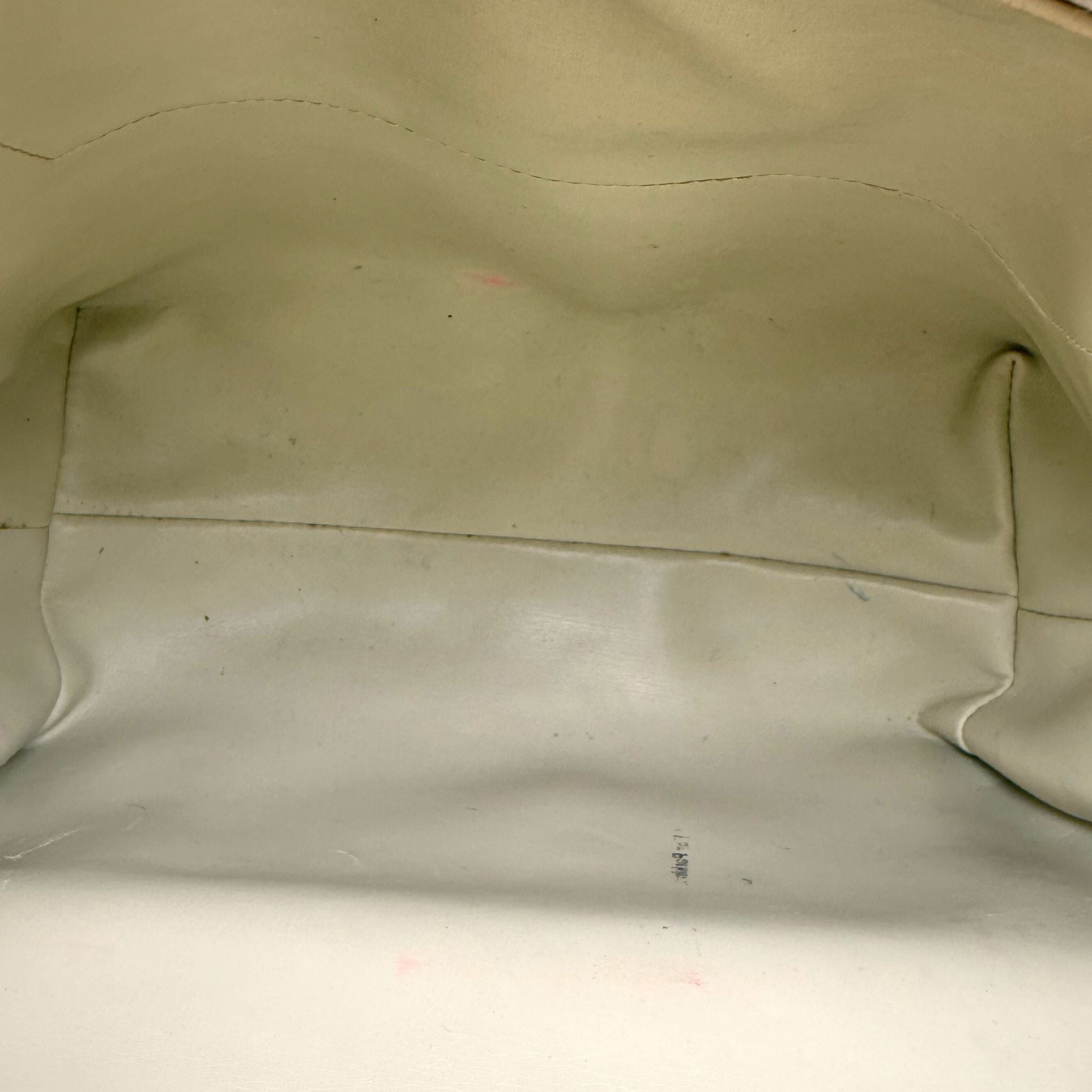 - Condition: B/C, Overall fair to good vintage condition. Includes moderate exterior wear, deformation, and discoloration. Heavy scratching and discoloration on gold-color hardware throughout. Interior is in good condition with moderate discoloration and staining from casual use. Bag is structurally sound with just cosmetic staining and wear. Straps are yellowing with scuffs along the edges.
