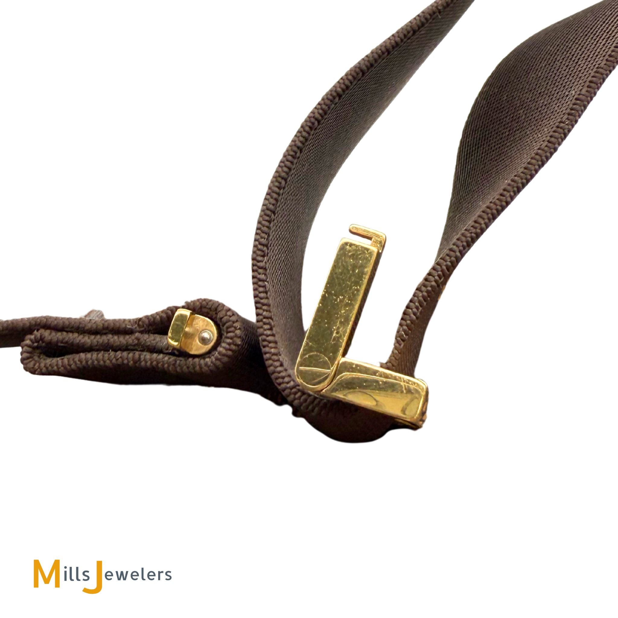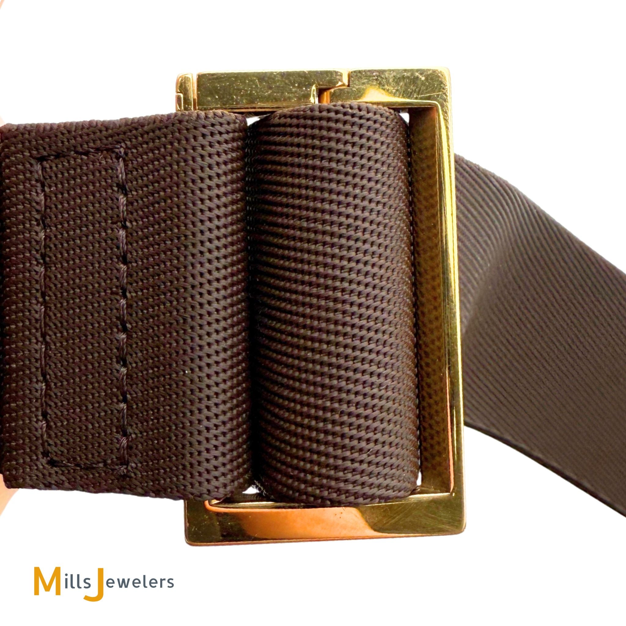 - Exterior: Brown damier ebene coated canvas with a gold-color side zipper, hidden pocket on the back of the bag with a velcro closure, and a flat pocket on the wing of the bag with a snap closure. Crossbody strap is adjustable and features a thick brown cotton strap, gold-color branded fastener, gold-color strap tip, and a leather strap stay.