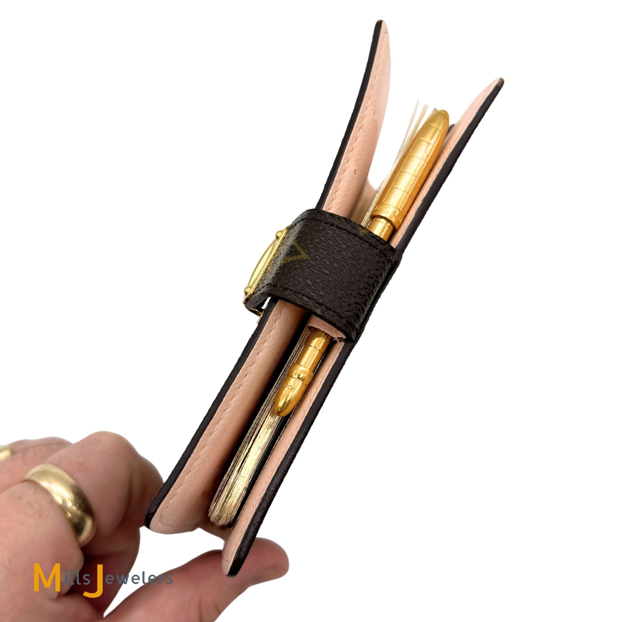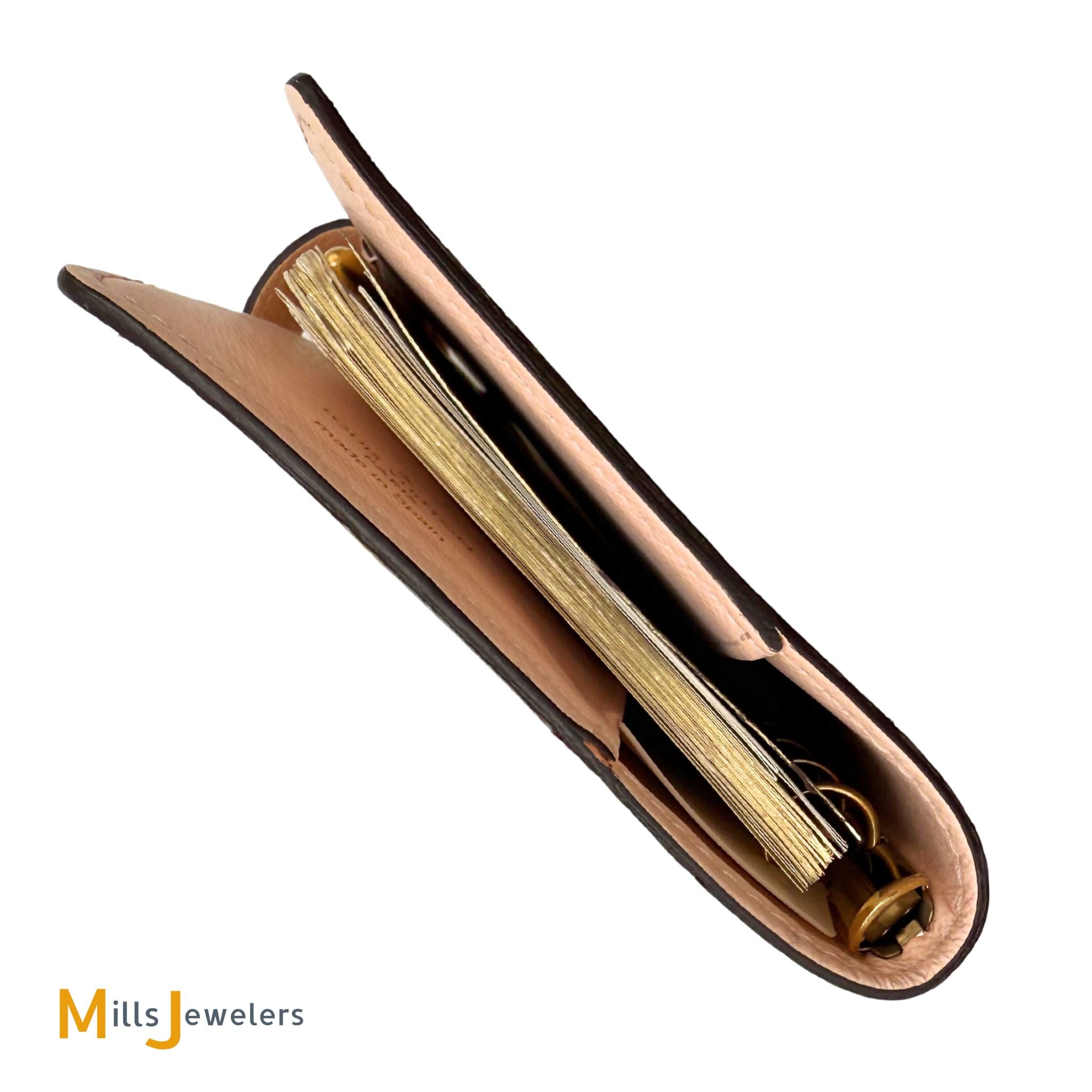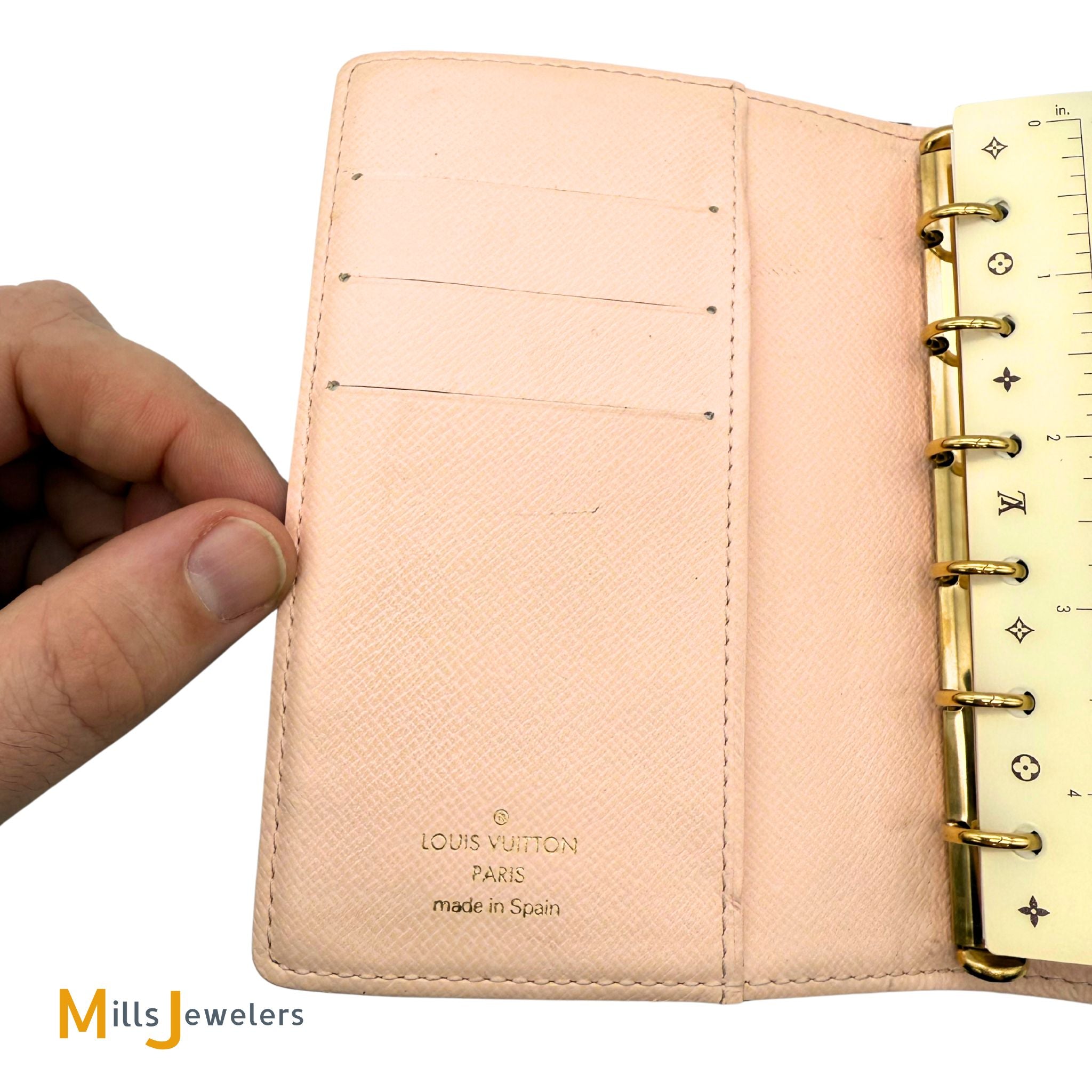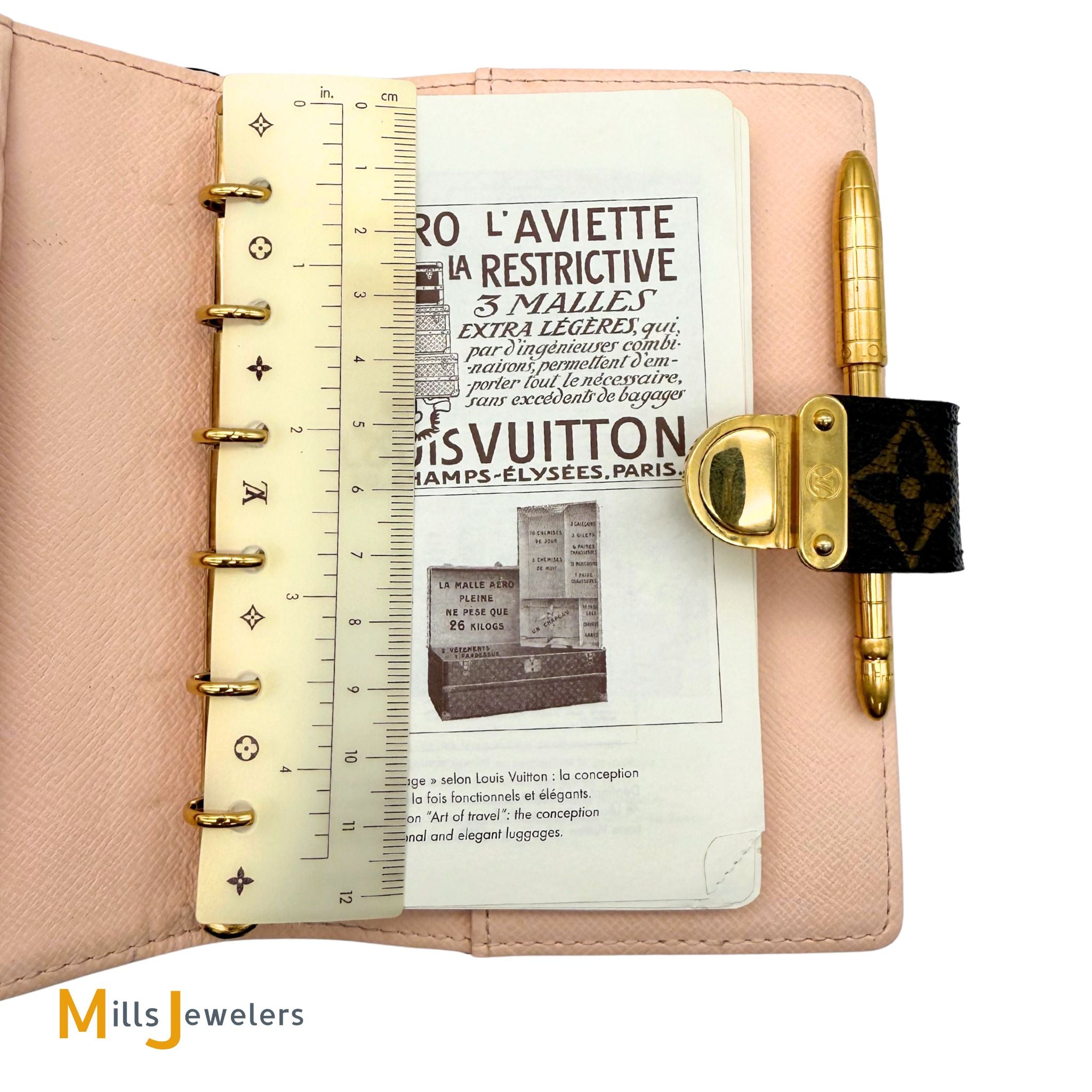 - Interior: Rose Ballerine cowhide leather with three (3) card slots and two (2) internal flat pockets on each side. Gold-color pen with a rose ballerine leather loop holding it in place. Gold-color 6-ring binder holds a branded ruler, branded lined paper, and various pages highlighting maps and time zones. Louis Vuitton plastic ruler included measures up to 12cm or 4.5in.