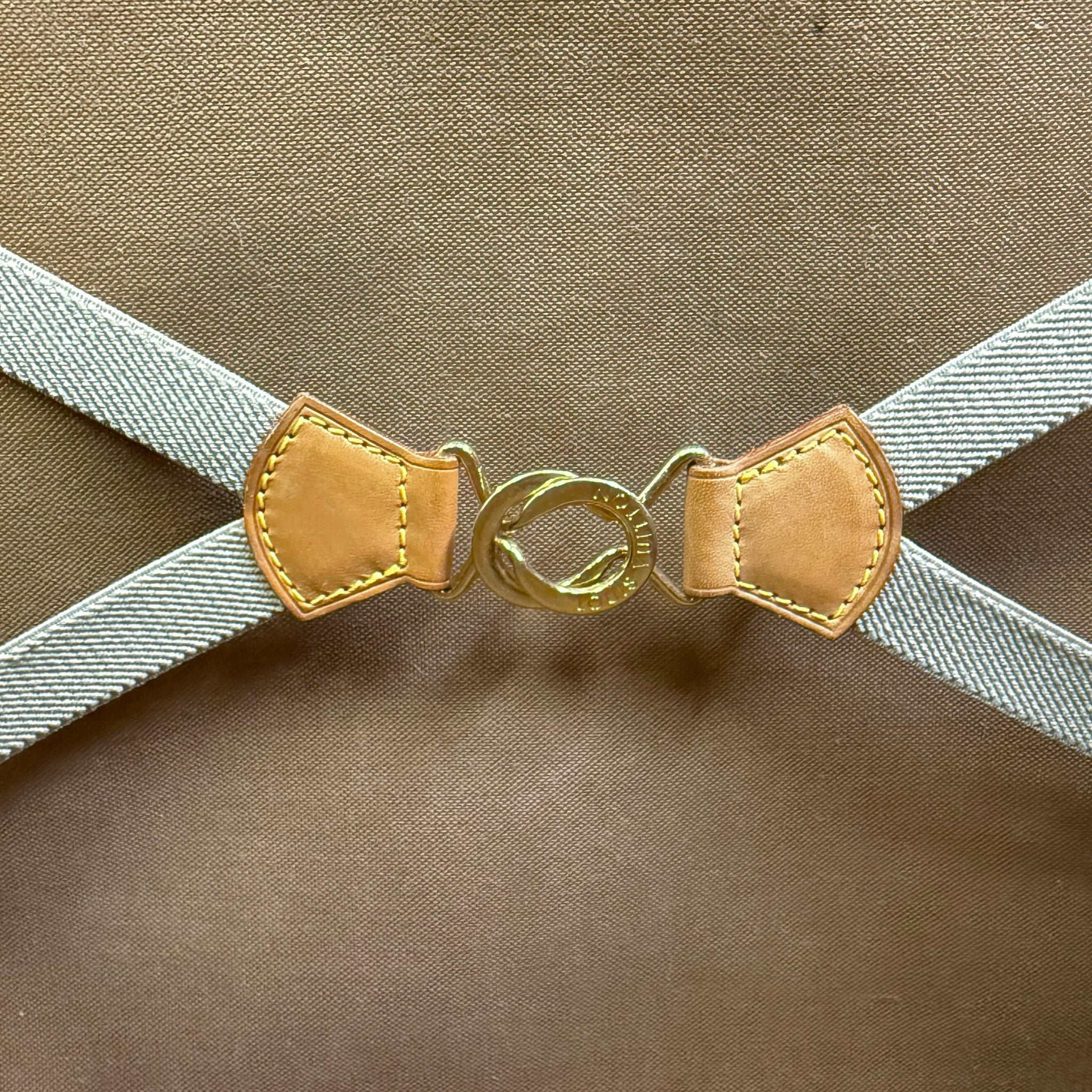 - Interior: Front side has one (1) flat open pocket and one (1) zippered pocket with an LV branded lock on the zipper. Both pockets have a brown canvas lining with the zippered pocket also having two (2) elastic bands that secure together with a loop system. Back side has two (2) open pockets with one (1) bigger open pocket. All three (3) pockets have a brown canvas lining on the inside.