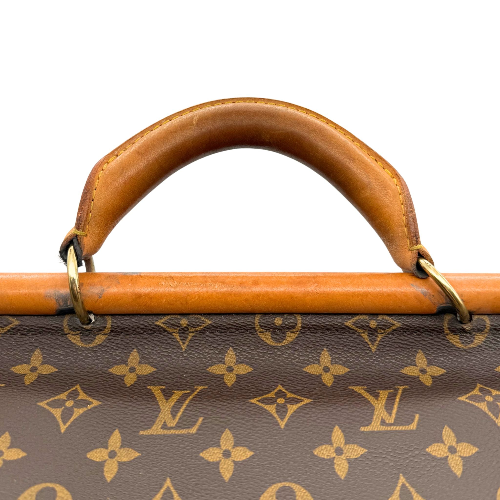 - Exterior: Monogram coated canvas with cowhide trim. Gold-colored brass hardware throughout with a leather wrapped dowel where the top handle is. One (1) cowhide leather luggage tag. Two (2) cowhide leather closures on the sides of the bag. Does not come with the shoulder strap.